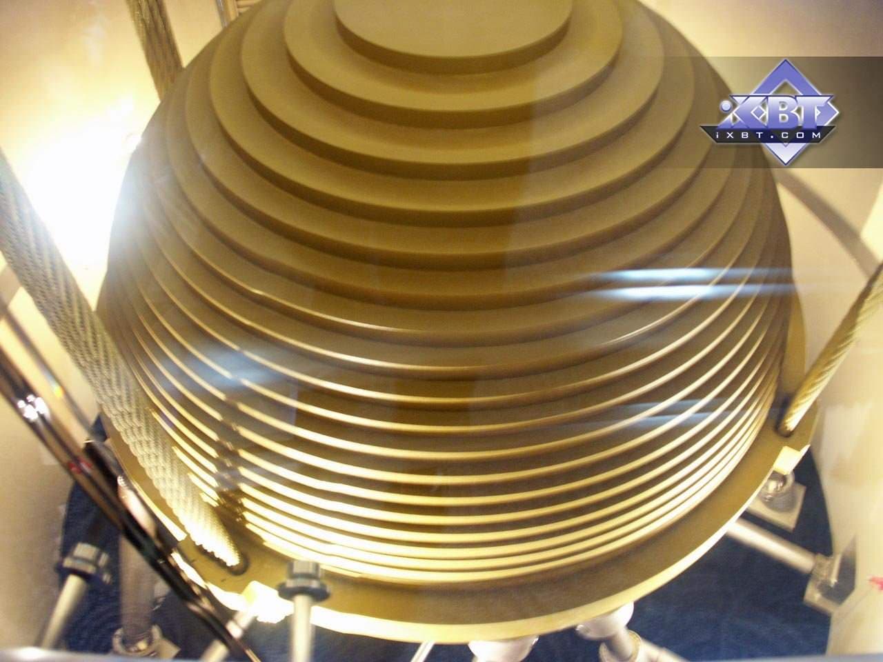 | Коротко поясню, как достигается такая устойчивость столь высокого здания в сейсмоопасной зоне. Как можно ранее было видеть из фотографий недоскреба, он состоит из секций на манер перевернутой елочки (у китайцев своя версия — на манер бамбука). Внутри каждой секции находится вот такой шар огромного веса, который висит на цепях и одновременно поддерживается и управляется гидравликой снизу. При определенной силе ветра или подземном толчке, когда здание начинает отклоняться, тут же срабатывает механизм, и шар движется в противоположную к наклону сторону, компенсируя своим весом отклонение от вертикали (смещается центр тяжести). Все механизмы шаров соединены между собой, поэтому работает как бы единое целое, заставляя башню в целом быть живой и быстро реагировать на воздействие внешних факторов. Кстати, многие высокие дома в Тайпее оснащены амортизаторами, которые сглаживают воздействие подземной стихии. |  |