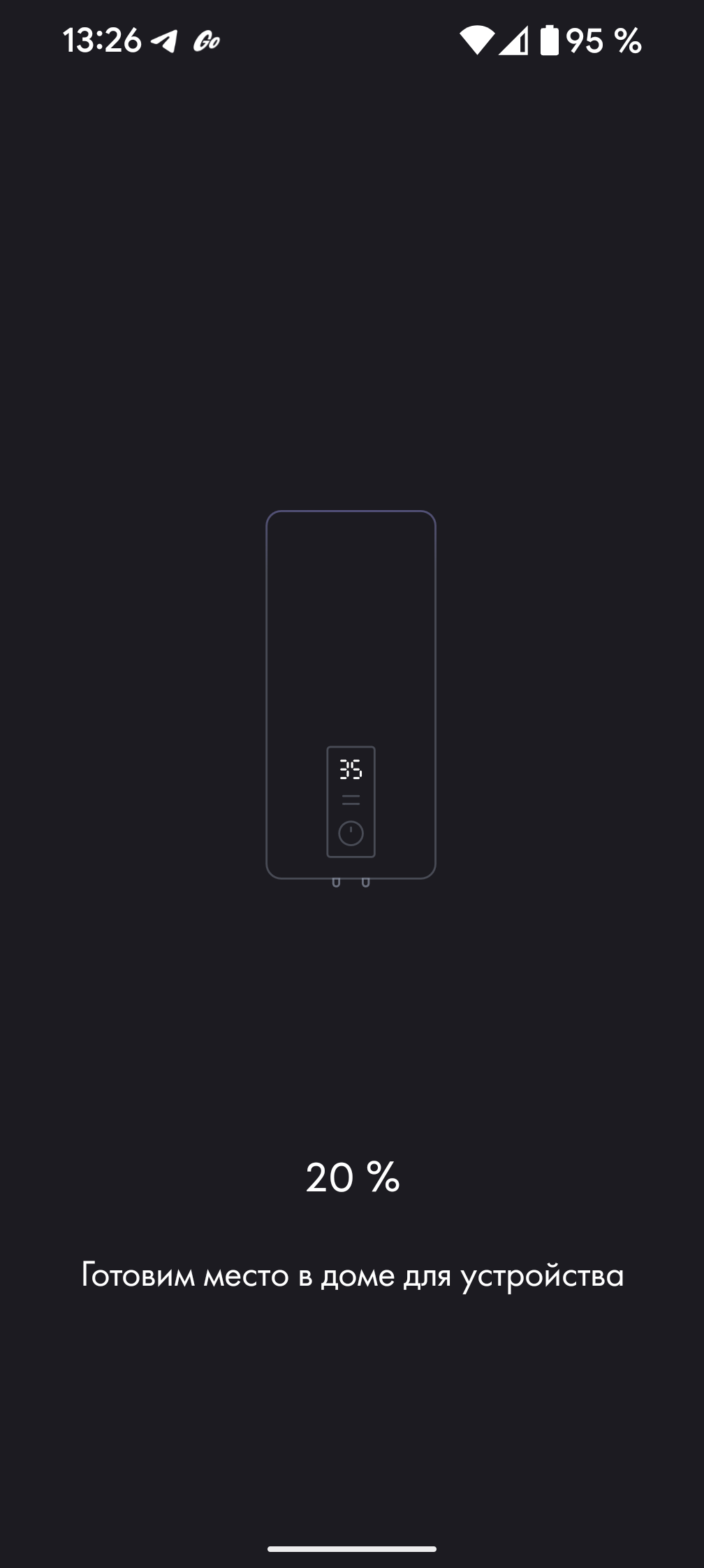 Чтобы бойлер обнаружился, его следует вывести из спящего режима нажатием на кнопку «Power» и следовать инструкциям. Приложение запрашивает данные для подключения к нашей беспроводной сети и через непродолжительное время устройство появляется на главном экране. На последнем этапе происходит автоматическое обновление встроенной микропрограммы.
