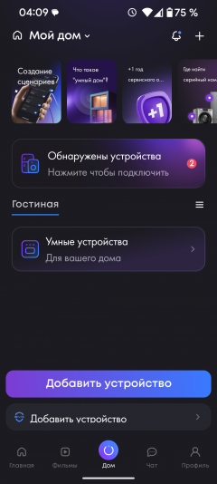 Для использования программы требуется регистрация с подтверждением номера телефона. Можно воспользоваться также входом с Яндекс ID. Как обычно, после аутентификации мы предоставляем приложению права на доступ к обнаружению новых устройств и нажимаем на кнопку «Добавить устройство» на главном экране.