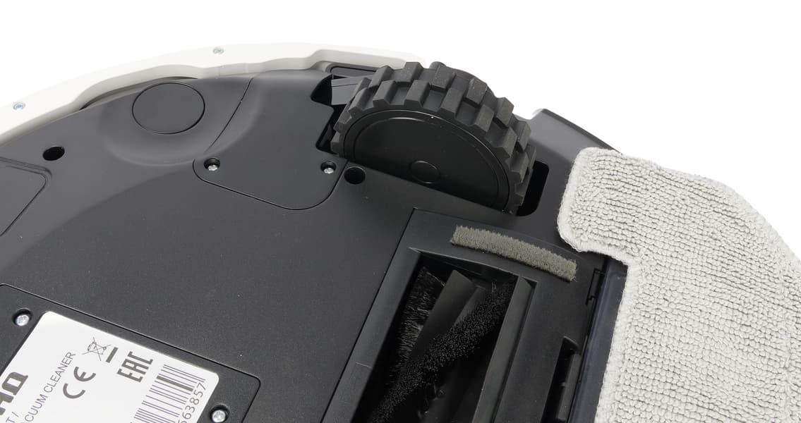 В задней части устройства расположен комбинированный модуль для сбора мусора и влажной уборки. Он, как водится, фиксируется на своем месте с помощью кнопки-защелки.