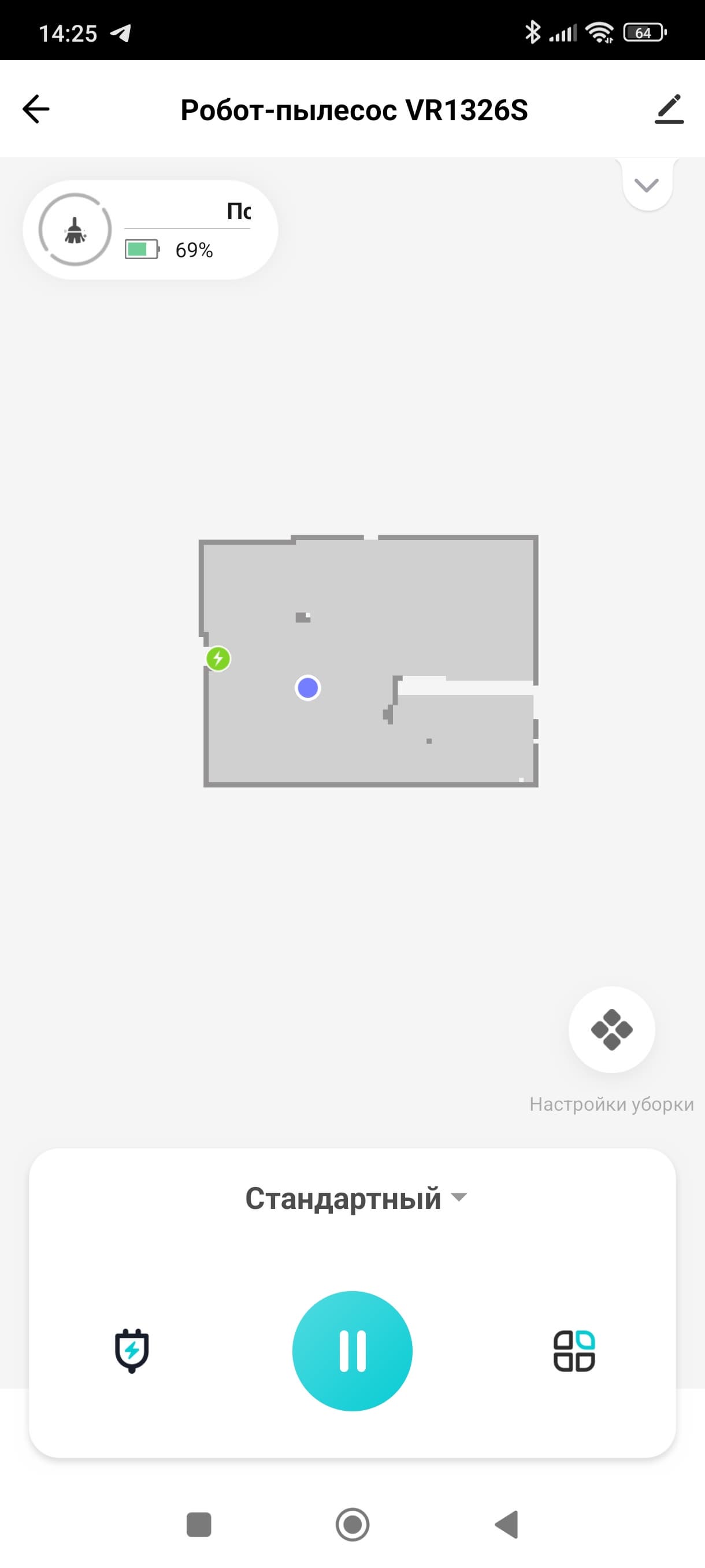 На главном экране отображаются карта помещения, время текущей или последней уборки, обработанная площадь и заряд батареи.