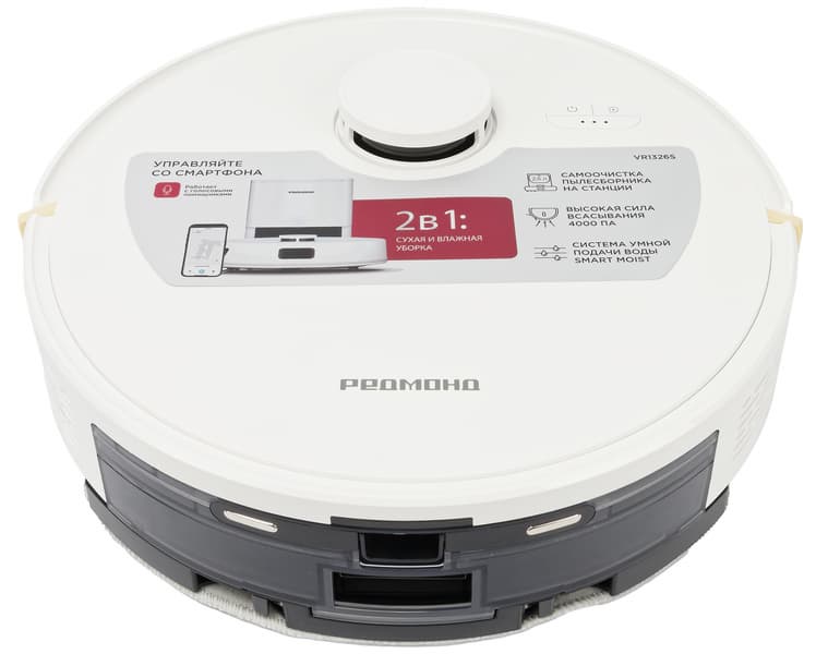 Redmond VR1326S, поступивший к нам на тестирование, вписывается в концепцию компактности: в случае данной модели мы получаем миниатюрную станцию для сбора сухого мусора и робот с чуть меньшими габаритами, чем у большинства подобных устройств (на глаз это, правда, заметить вряд ли получится).