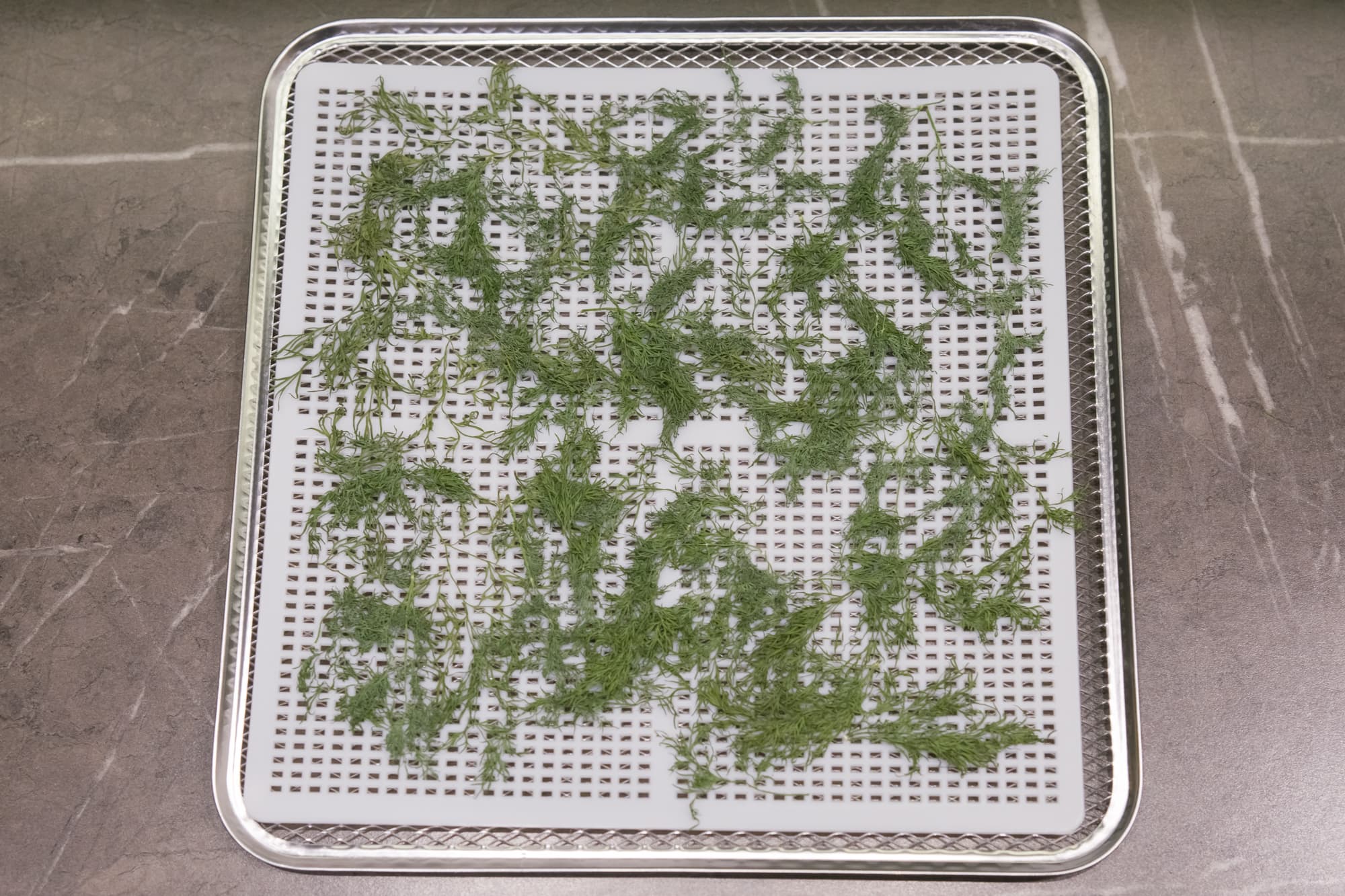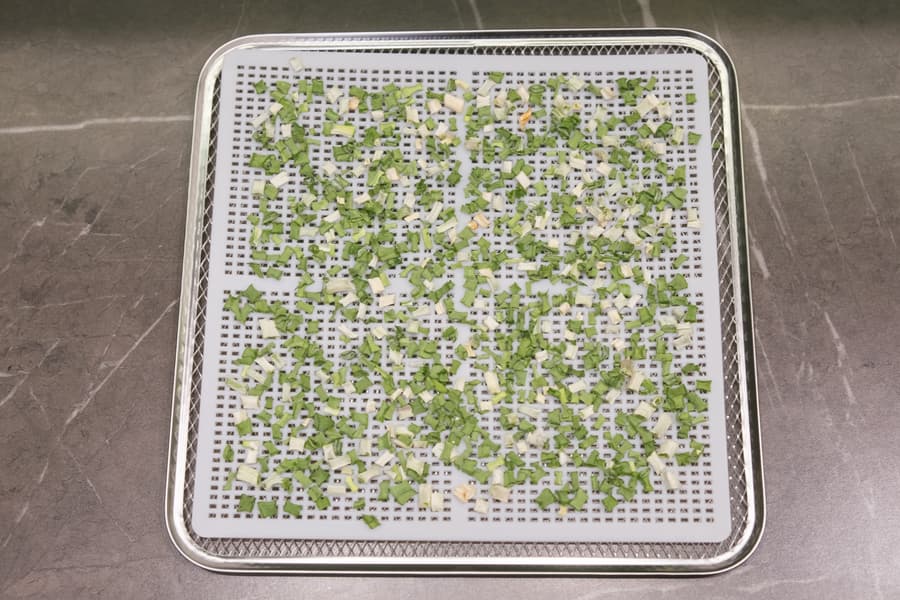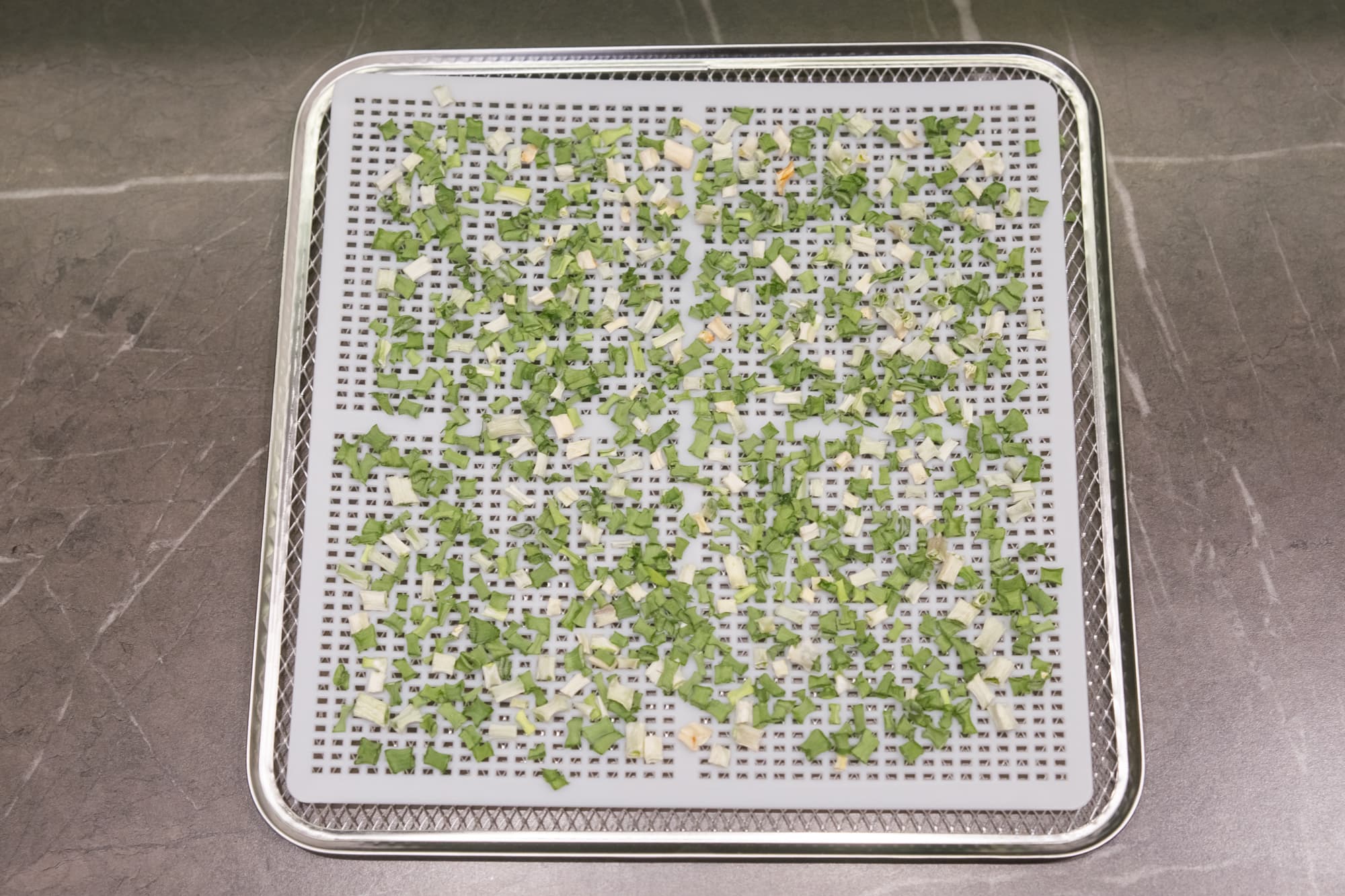 Сушка зелени происходила в авторежиме «Травы», с установленной по умолчанию температурой 40 °C. Мелко нарезанный зеленый лук разложили на пластиковые сетчатые поддоны. На одном уровне удалось разместить 100 г.