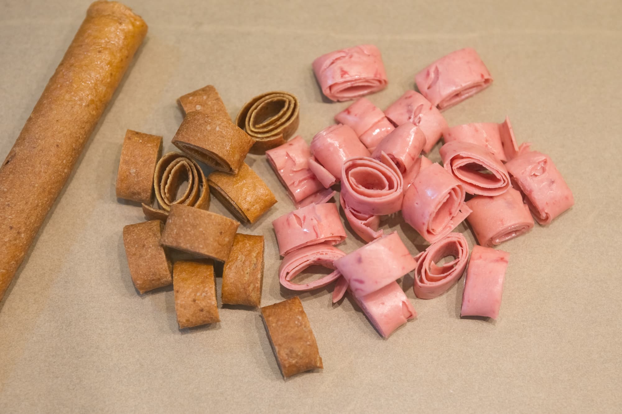 Ломтики курицы, предварительно замаринованные в соусе терияки, тонко нарезали и разложили на пластиковые поддоны.
