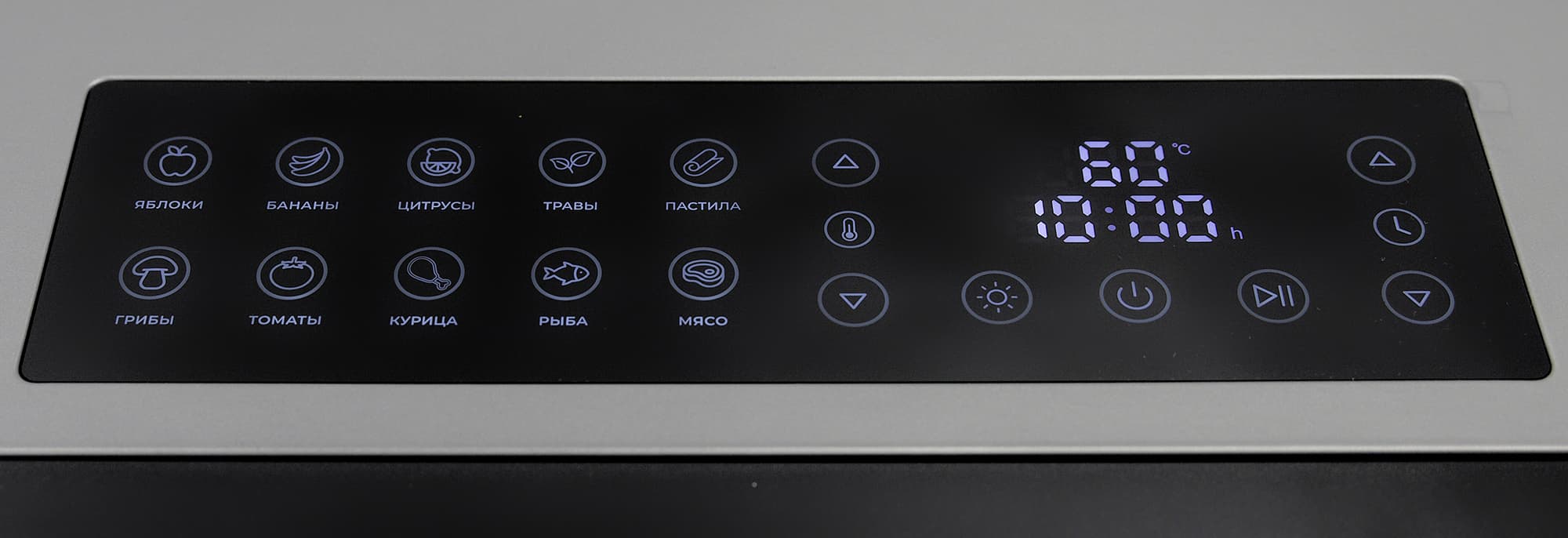 Панель управления Wollmer JD500 Sahara условно делится на две части: слева находятся сенсоры выбора авторежимов, справа — функциональные кнопки, отвечающие за настройку параметров, запуск/остановку программы, включение подсветки в камере и включение/выключение самого устройства.