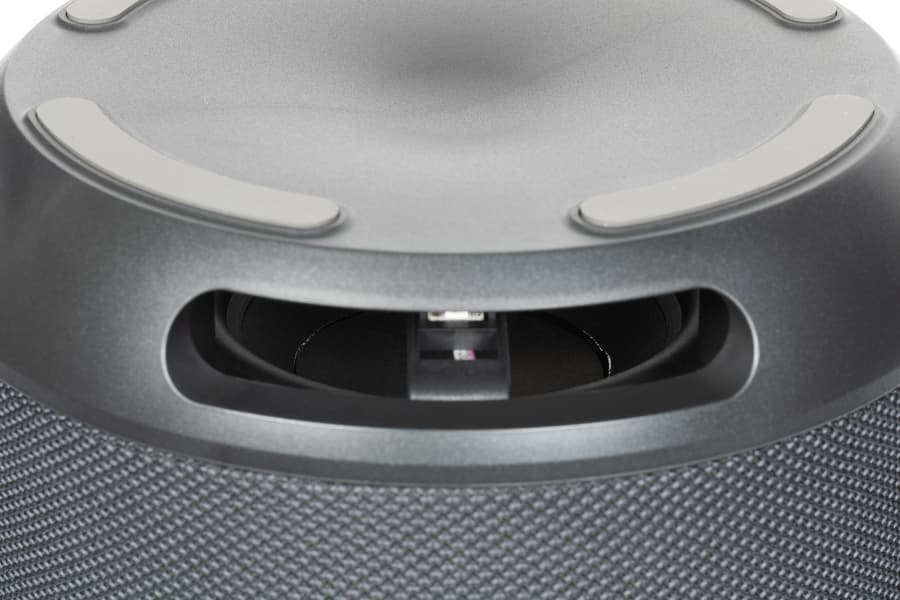 Общая заявленная мощность системы составляет 90 Вт — этого достаточно, чтобы уверенно озвучить не только комнату, но и открытую площадку. Звук получается насыщенным, объемным и способным держать внимание аудитории, даже если колонка стоит в центре большого пространства. Встроенный цифровой сигнальный процессор (DSP) поддерживает два режима звучания, переключаемых нажатием на центральный регулятор. Один из них акцентирует бас, добавляя плотности и энергии трекам, второй оставляет звук более нейтральным. Это позволяет адаптировать звучание под разные сценарии — от танцевального сета на вечеринке до фонового музыкального сопровождения в помещении.