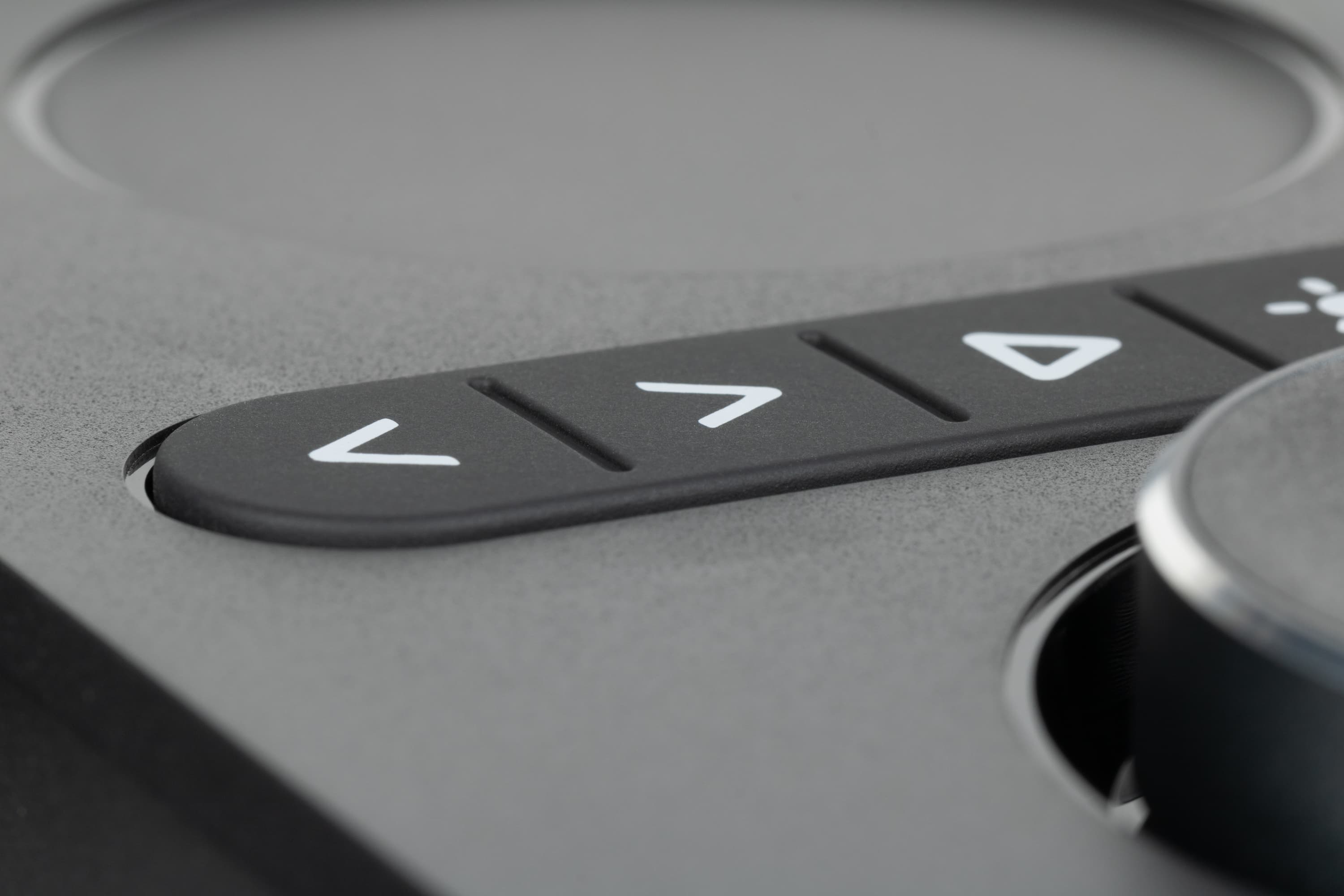 За закрытой тканью боковой поверхностью скрываются четыре динамика диаметром 2,5 дюйма, направленные в разные стороны. Именно они обеспечивают одну из главных особенностей модели — равномерное всенаправленное звучание. Панель управления расположена сверху и включает несколько клавиш, а также крупный поворотный регулятор громкости.
