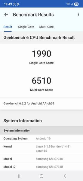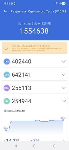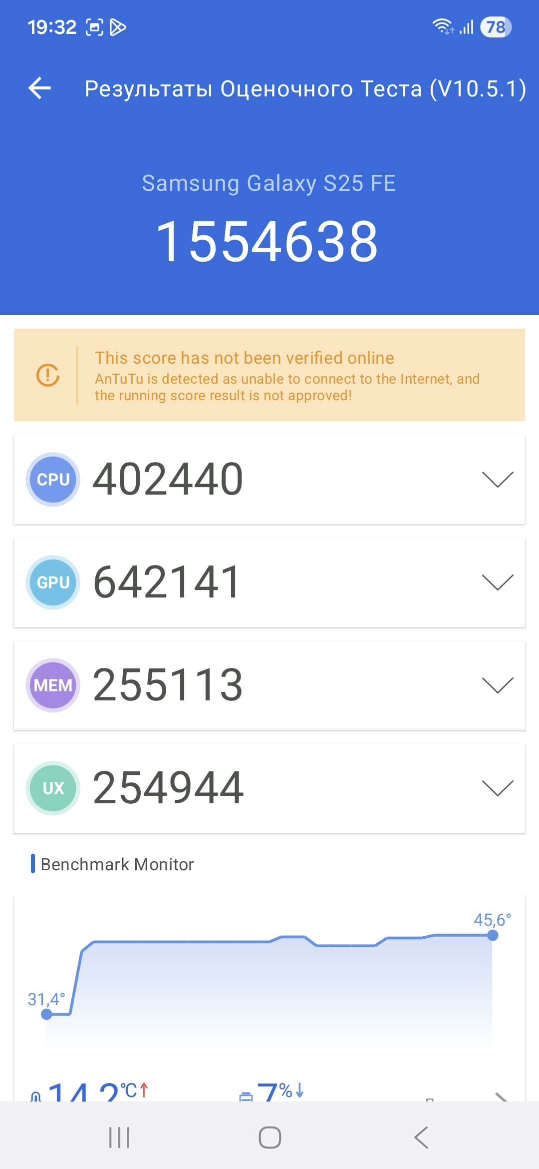 Samsung Galaxy S25 FE работает на десятиядерной SoC Exynos 2400, которая производится по нормам 4-нанометрового техпроцесса. Это SoC высокого уровня, истинно субфлагманская. С ней смартфон набирает в AnTuTu более 1,5 млн баллов. Такой производительности с лихвой хватает для выполнения любых реальных задач, включая видеосъемку в 4К@60 fps, хотя съемку 8K-видео смартфон «не тянет». С требовательными играми аппарат также справляется на высоких настройках, но и уровень тротлинга здесь неслабый.