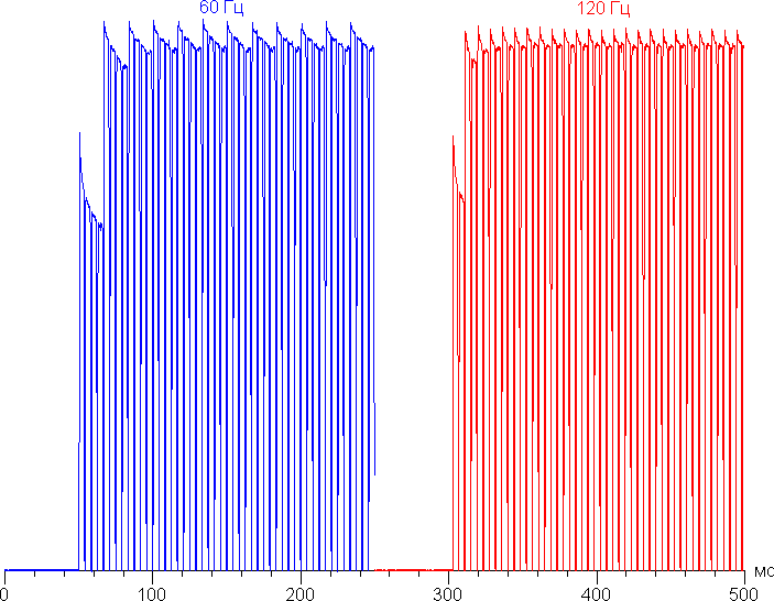 Переключение состояния элементов матрицы выполняется практически мгновенно, но на фронте включения может присутствовать ступенька шириной примерно 17 мс (что соответствует частоте обновления экрана примерно в 60 Гц) или примерно 8 мс (120 Гц). Например, так выглядит зависимость яркости от времени при переходе от черного к белому: