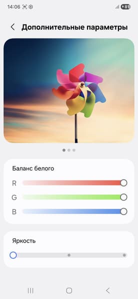 Только при выборе профиля Насыщенные цвета появляется возможность настройки цветового баланса регулировкой цветовой температуры и тремя регулировками интенсивности основных цветов, и дополнительно можно снизить или увеличить насыщенность цветов настройкой Яркость (три значения).