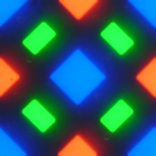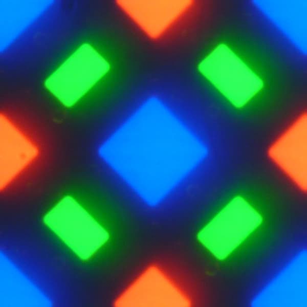 В этом экране используется матрица AMOLED — активная матрица на органических светодиодах. Полноцветное изображение создается с помощью субпикселей трех цветов — красного (R), зеленого (G) и синего (B), но красных и синих субпикселей в два раза меньше, что можно обозначить как RGBG. Это подтверждается фрагментом микрофотографии: