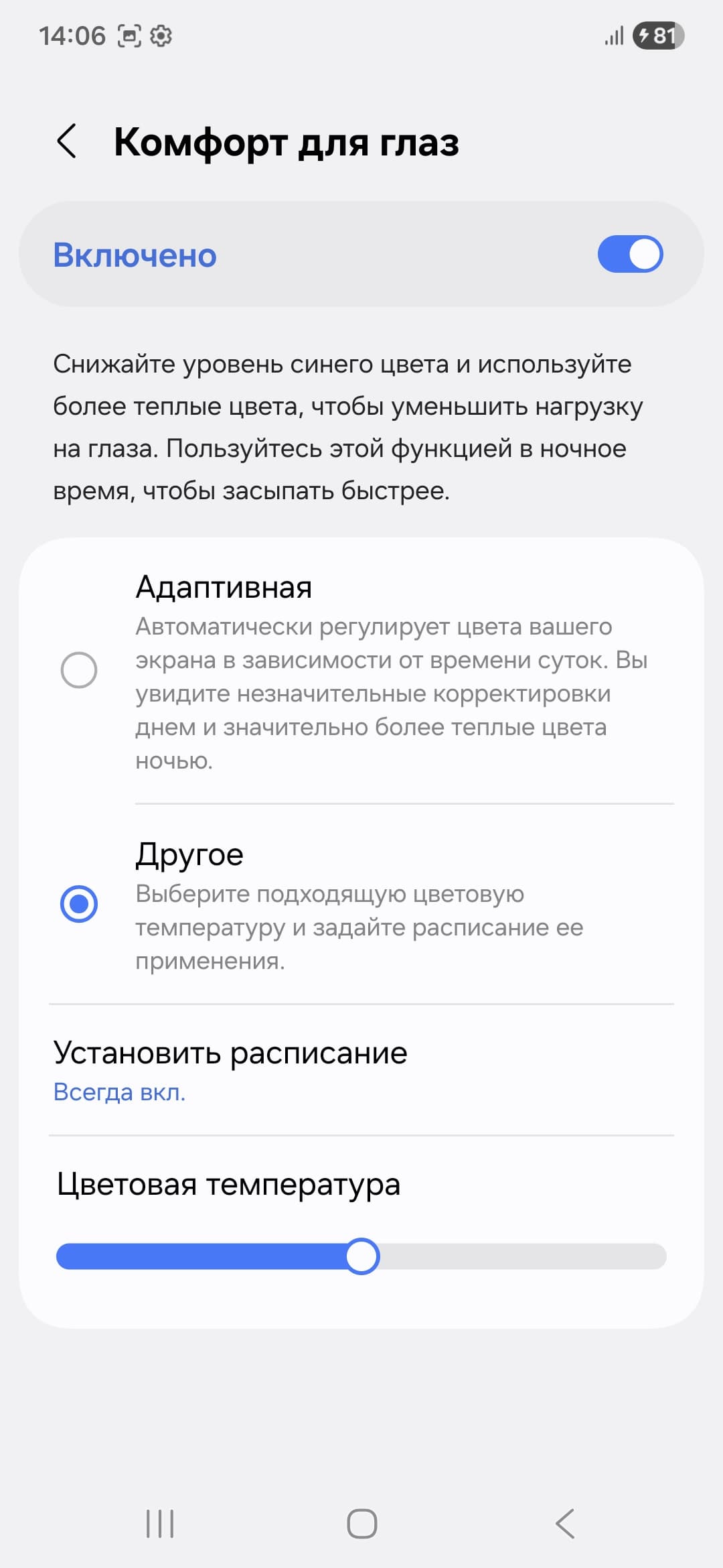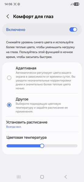 Есть функция Комфорт для глаз, для которой в настройках даже приведено белее-менее корректное описание.