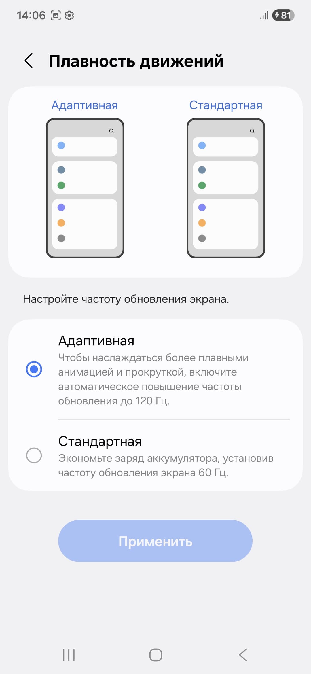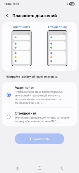 В настройках экрана можно включить режим с повышенной до 120 Гц частотой обновления. В этом режиме нам как минимум обещают увеличение плавности прокрутки.