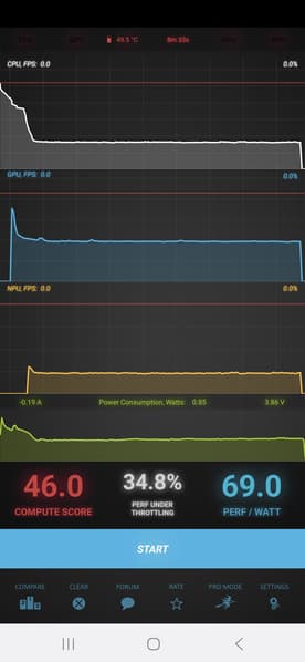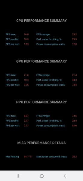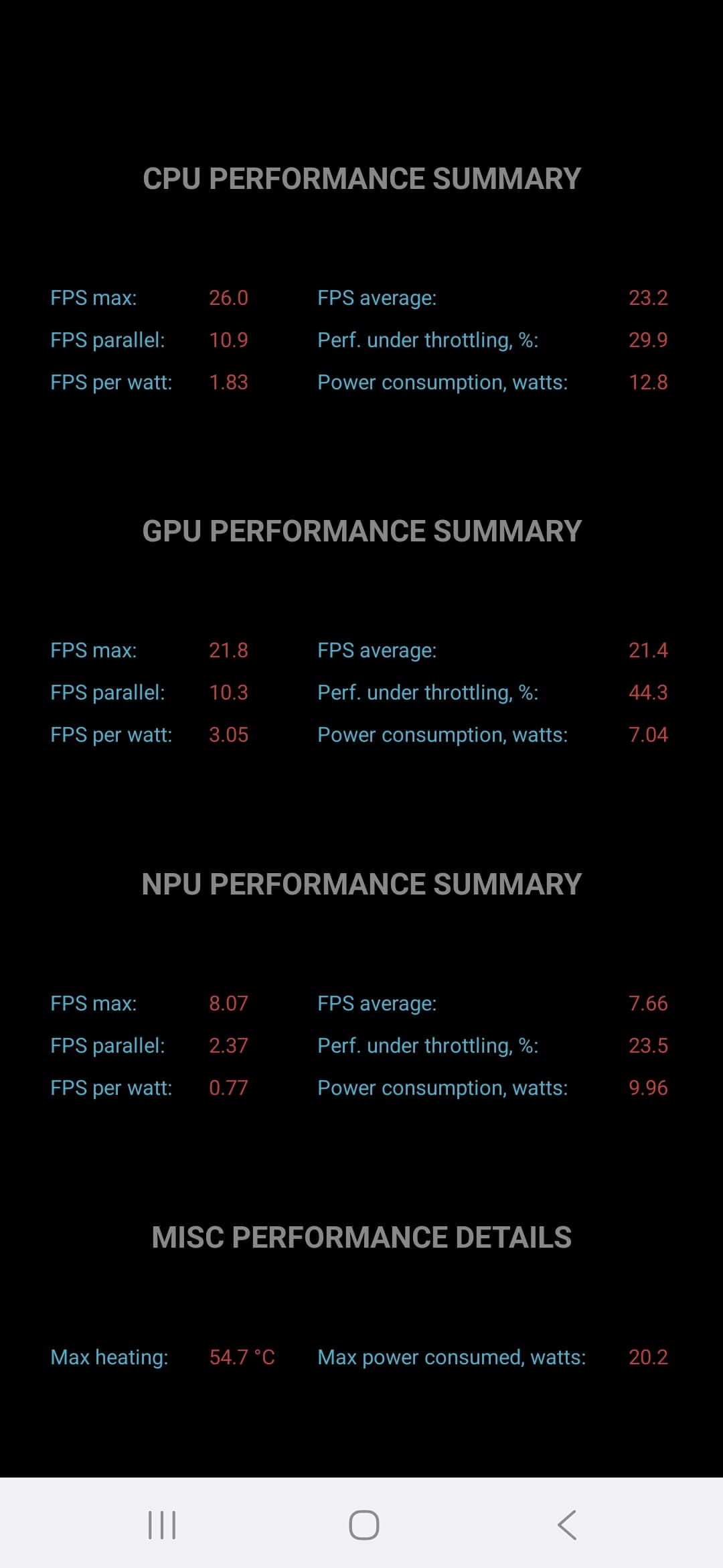 Тест на снижение производительности при нагреве мы проводим с помощью программы Burnout Benchmark, которая позволяет нагружать CPU, GPU и NPU. Уровень тротлинга, согласно тестам, действительно высокий.