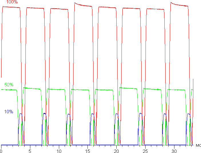 На любом уровне яркости присутствует значимая модуляция с частотой 480 Гц. На рисунке ниже приведены зависимости яркости (вертикальная ось) от времени (горизонтальная ось) для нескольких значений настройки яркости: