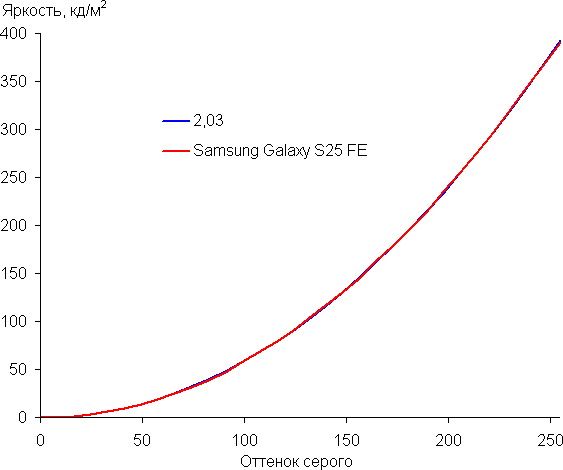 Напомним, что в случае OLED-экранов яркость фрагментов изображения динамично меняется в соответствии с характером выводимого изображения — чуть уменьшается для светлых в целом изображений. В итоге полученная зависимость яркости от оттенка (гамма-кривая), скорее всего, не соответствует гамма-кривой статичного изображения, так как измерения проводились при последовательном выводе оттенков серого почти на весь экран.