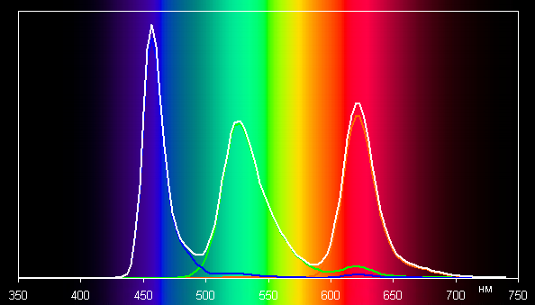 В первом случае спектры компонент (то есть спектры чистых красного, зеленого и синего цветов) очень хорошо разделены: