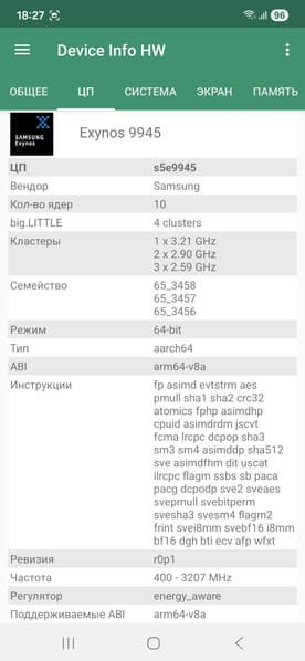 - SoC Exynos 2400, 10 процессорных ядер (1×Cortex-X4 @3,2 ГГц + 2×Cortex-A720 @2,9 ГГц + 3×Cortex-A720 @2,6 ГГц + 4×Cortex-A520 @1,95 ГГц)