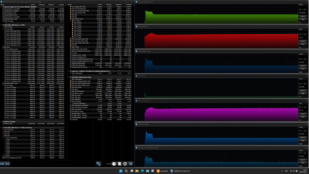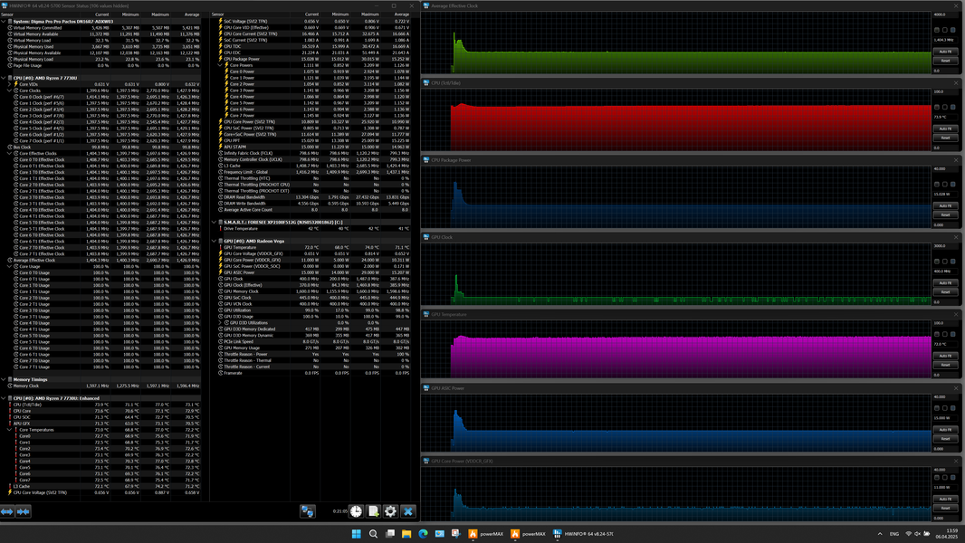 Digma Pro Pactos оснащен мобильным процессором AMD Ryzen 7 7730U с восемью двухпотоковыми ядрами, тактовая частота которых может достигать 2 ГГц при стабильной работе и 4,5 ГГц в турборежиме. TDP 15 Вт, максимальная рабочая температура — 95 °C. В тестах под нагрузкой процессор отбирал до 30 Вт мощности в турборежиме и 15 Вт при стабильной работе. Тактовая частота в период буста составляла лишь 2,7 ГГц, что существенно меньше паспортного максимума.