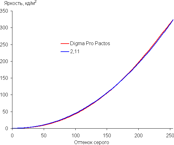 Аппроксимация полученной гамма-кривой дала показатель 2,11, что немного ниже стандартного значения 2,2, поэтому картинка чуть высветлена. При этом реальная гамма-кривая слегка отклоняется от аппроксимирующей степенной функции: