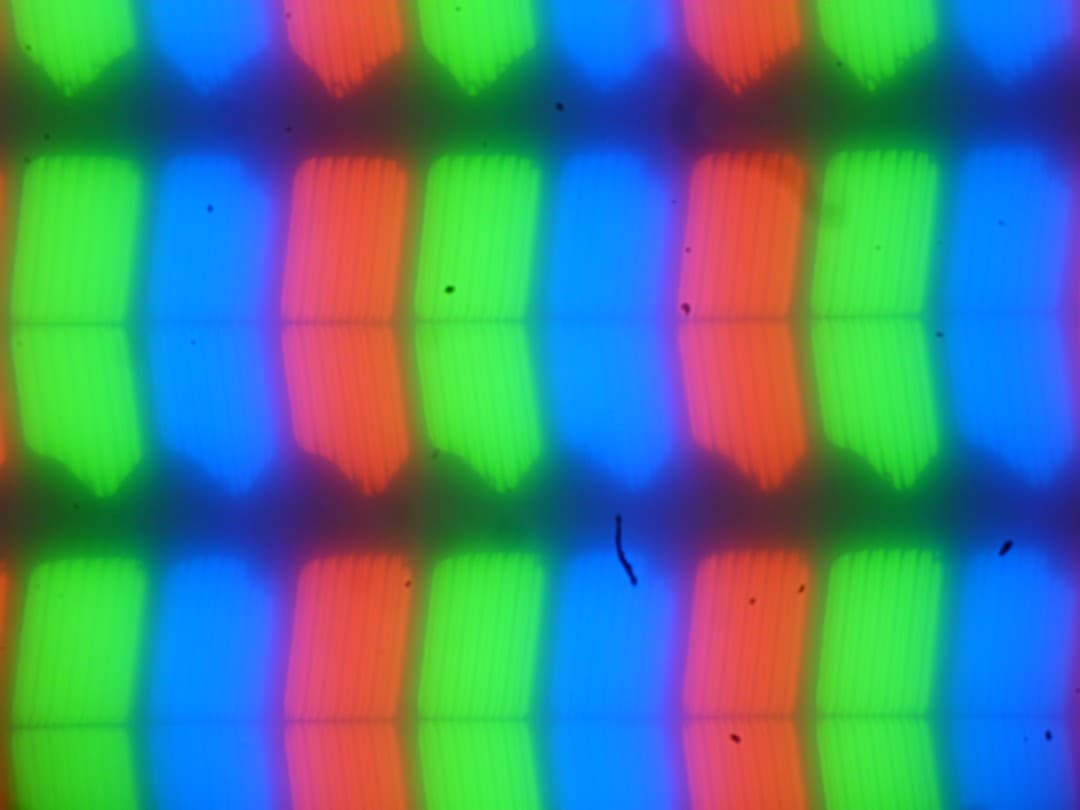В этом ноутбуке используется матрица типа IPS. Микрофотографии демонстрируют типичную для IPS структуру субпикселей (черные точки — это пыль на матрице фотоаппарата):