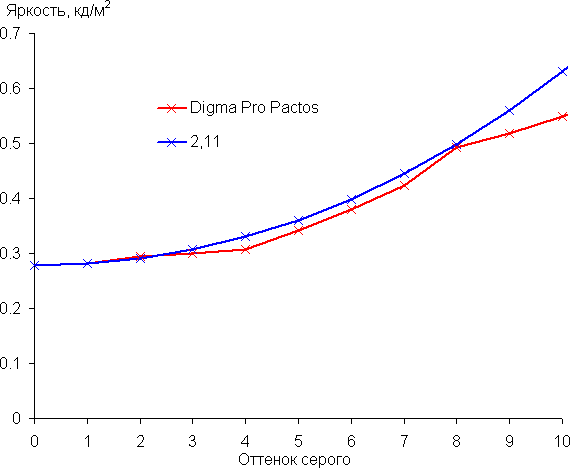 Рост прироста яркости на шкале серого в основном равномерный, и каждый следующий оттенок ярче предыдущего. В самой темной области аппаратно и визуально различаются все оттенки:
