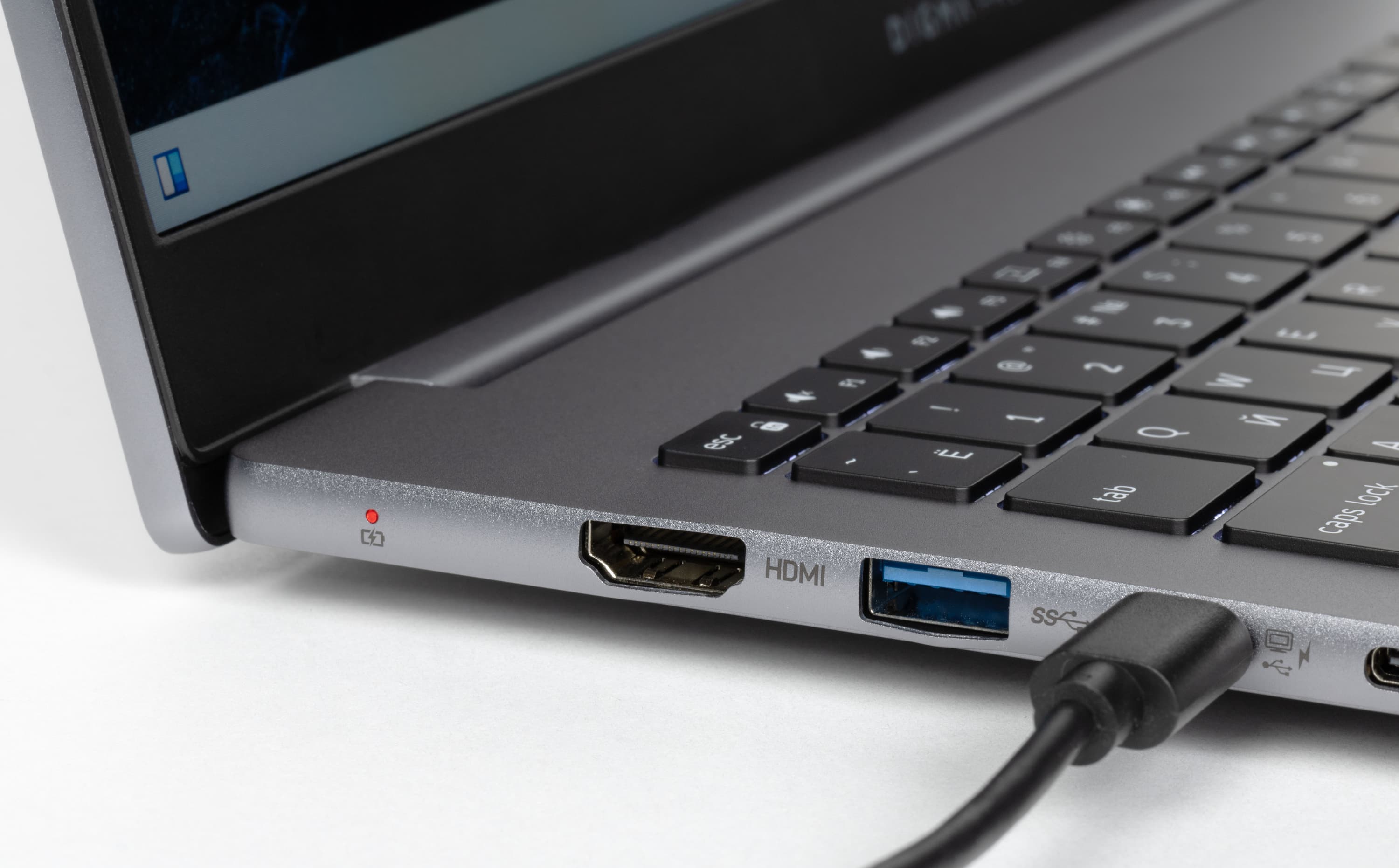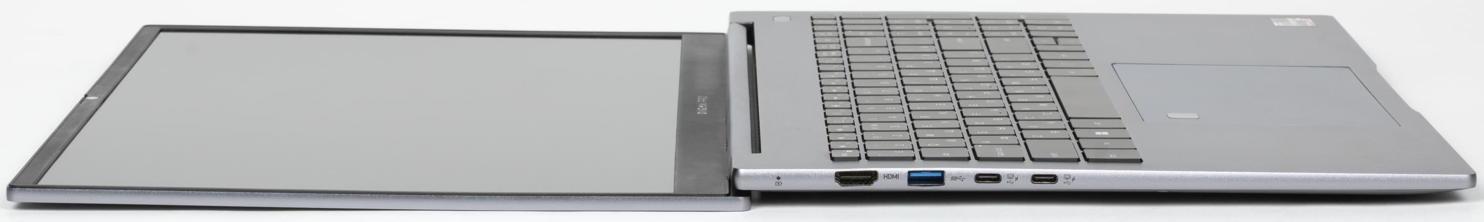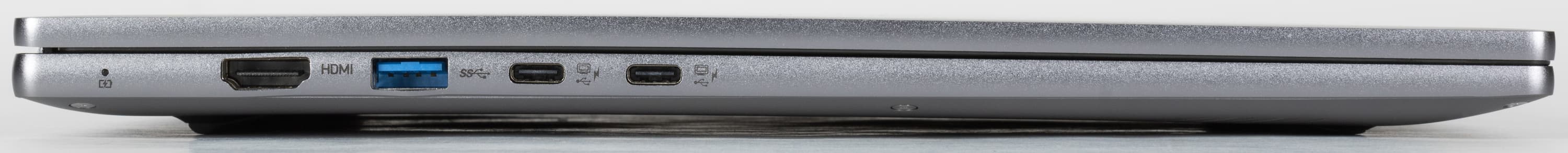 На левой боковой панели помещаются светодиодный индикатор зарядки батареи, видеовыход HDMI, один порт USB 3.2 Gen 2 Type-A и два порта USB 3.2 Gen 2 Type-C (с поддержкой DisplayPort и Power Delivery).