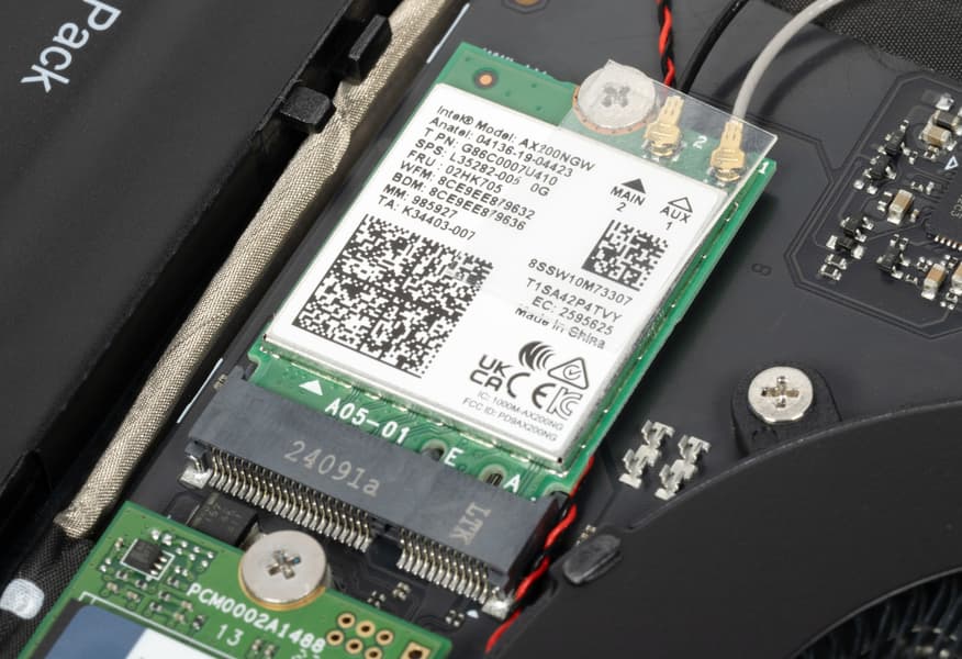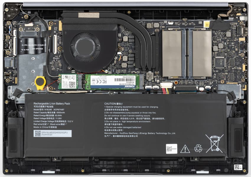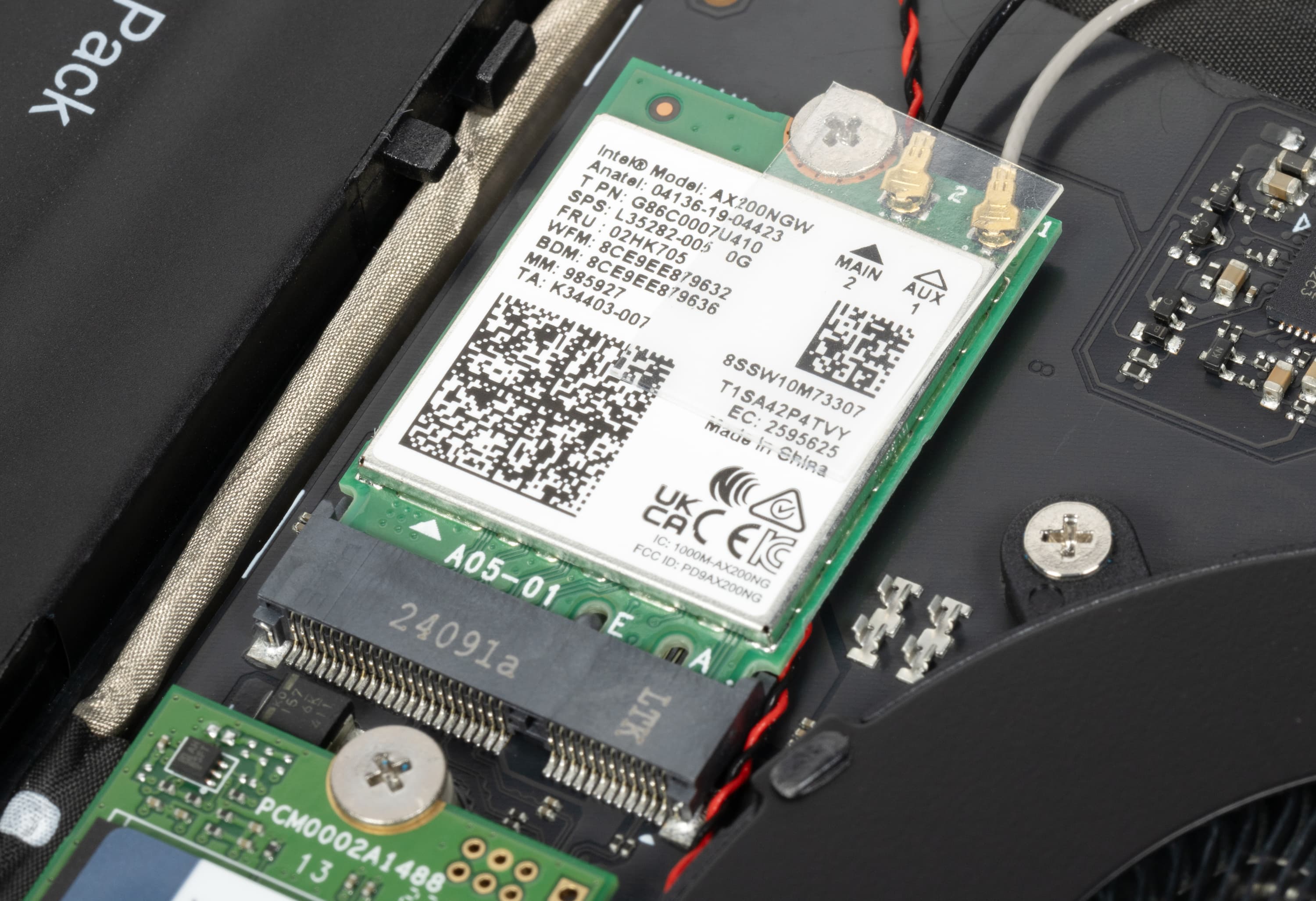 Оперативная память представлена двумя 8-гигабайтными модулями, которые можно заменить на более солидные и довести доступный объем ОЗУ вплоть до максимума 64 ГБ. Возможна замена системного NVMe-накопителя и адаптера Wi-Fi. Батарея крепится к корпусу винтами и подключается к собственному разъему, извлекается и устанавливается достаточно просто и быстро.
