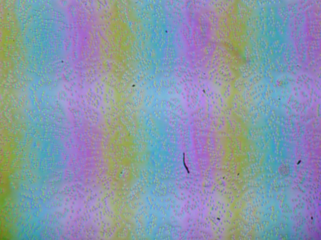 Зерно этих дефектов в несколько раз меньше размеров субпикселей (масштаб этих двух фотографий примерно одинаковый), поэтому фокусировка на микродефектах и «перескок» фокуса по субпикселям при изменении угла зрения выражены слабо, из-за этого нет и «кристаллического» эффекта.