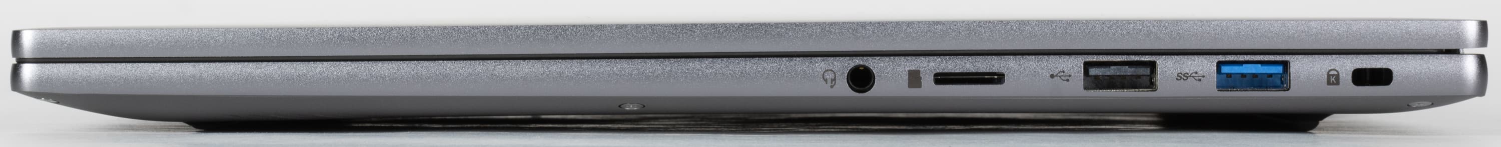 Справа расположен комбинированный аудиоразъем для подключения гарнитуры, слот картовода для носителей microSD, порты USB 2.0 и USB 3.2 Gen 2 Type-A, а также отверстие кенсингтонского замка.