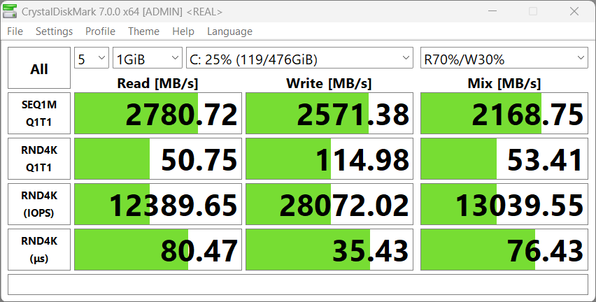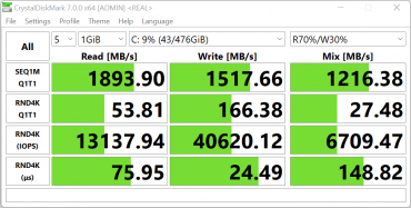 В роли системного хранилища выступает 512-гигабайтный NVMe-накопитель Foresee XP2100F512G с интерфейсом PCI Express 3 ×4. В процессе тестирования с помощью популярного бенчмарка CrystalDiskMark определим его возможности и сравним их c показателями накопителей, установленных в двух других бизнес-ноутбуках: