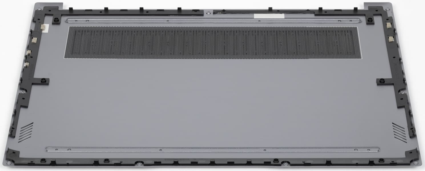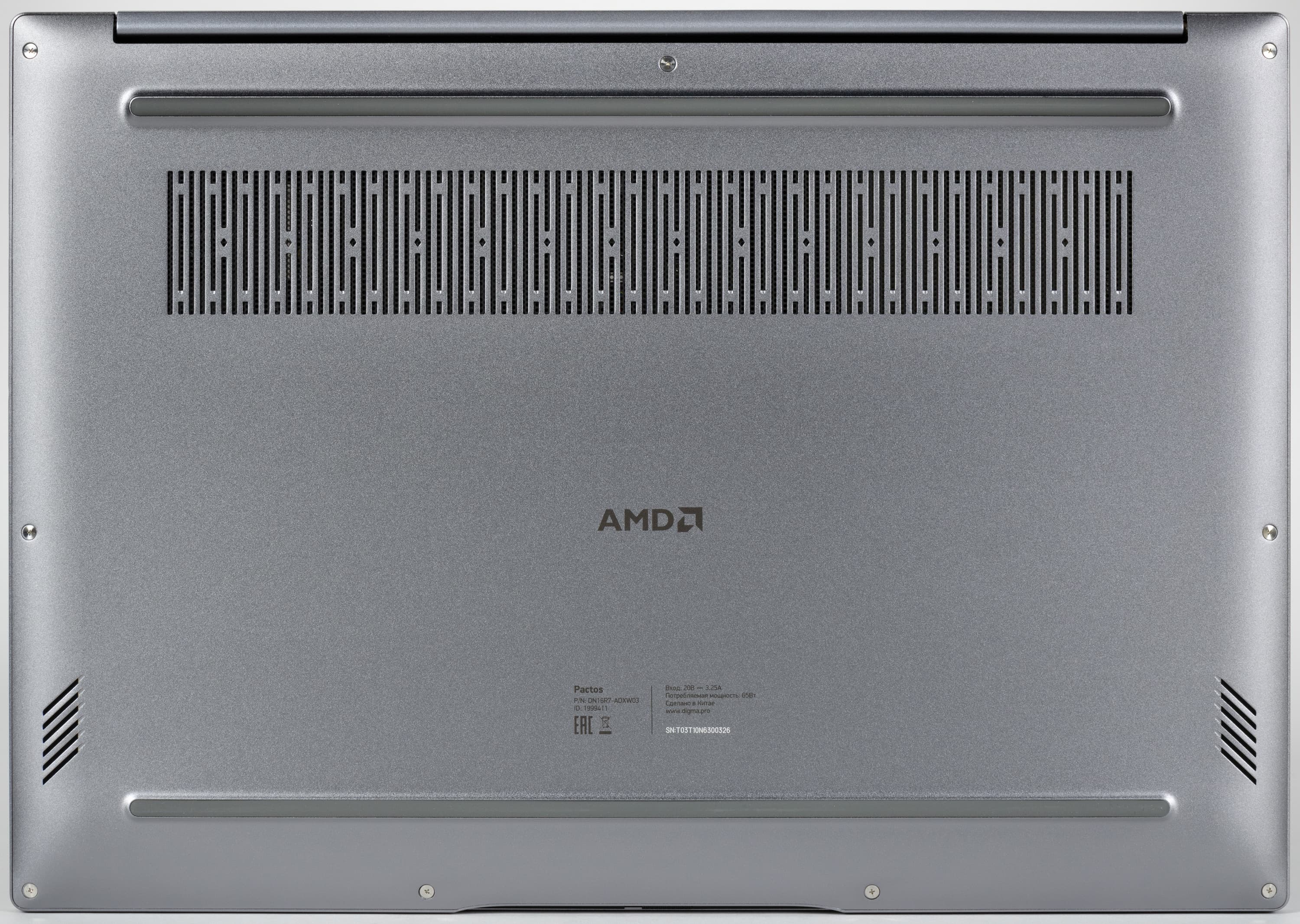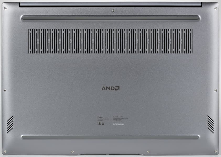 Днище гладкое, обладает традиционными изгибами для формирования истончений корпуса к периферии со всех четырех сторон — эта хитрость унаследована многими производителями от Macbook Air уже довольно давно и вполне оправдывает себя эстетикой и рационализмом конструкции, а равно и удобством пользования. На обороте машины обращают на себя внимание довольно крупный логотип AMD, относительно небольшая по площади (по сравнению с мощными портативными ПК) решетка воздухозаборника, а также передняя и задняя опоры в виде тонких линеек из эластичного полимера. Под левым и правым динамиками у переднего края ноутбука заметны решетки для выхода звука.