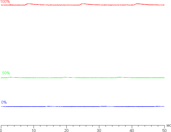На любом уровне яркости значимая модуляция подсветки отсутствует, поэтому нет и никакого мерцания экрана (нет ШИМ). В доказательство приведем графики зависимости яркости (вертикальная ось) от времени (горизонтальная ось) при различных значениях настройки яркости: