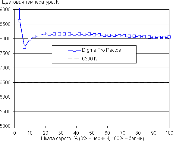 Баланс оттенков на шкале серого компромиссный, так как цветовая температура существенно выше стандартных 6500 К, но отклонение от спектра абсолютно черного тела (ΔE) ниже 2, что даже для профессионального устройства считается хорошим показателем. При этом цветовая температура и ΔE мало изменяются от оттенка к оттенку — это положительно сказывается на визуальной оценке цветового баланса. (Самые темные области шкалы серого можно не учитывать, так как там баланс цветов не имеет большого значения, да и погрешность измерений цветовых характеристик на низкой яркости большая.)