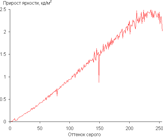 Далее мы измерили яркость 256 оттенков серого (от 0, 0, 0 до 255, 255, 255). График ниже показывает прирост (не абсолютное значение!) яркости между соседними полутонами: