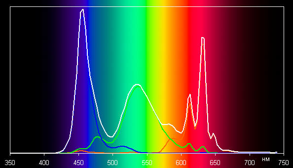 Поэтому визуально цвета изображений, ориентированных на вывод в пространстве sRGB, на этом экране имеют естественную насыщенность. Ниже приведен спектр для белого поля (белая линия), наложенный на спектры красного, зеленого и синего полей (линии соответствующих цветов):