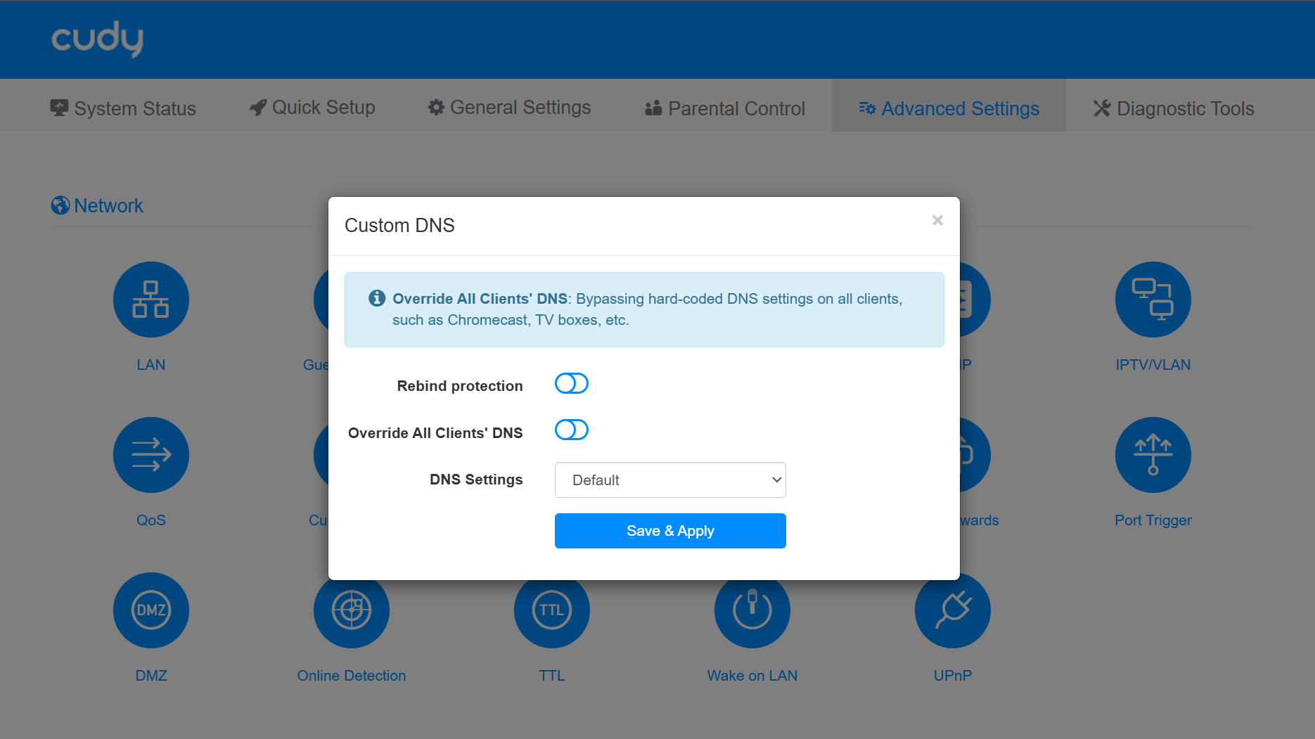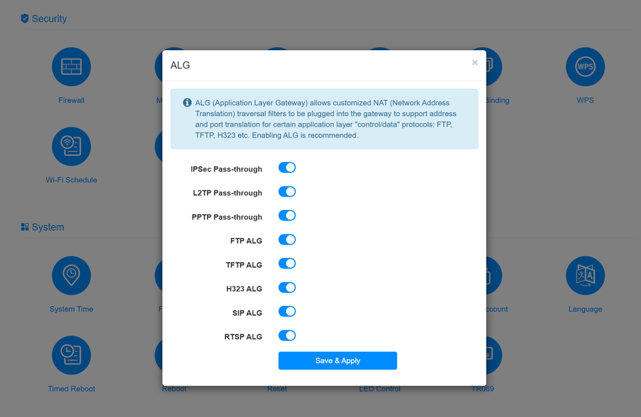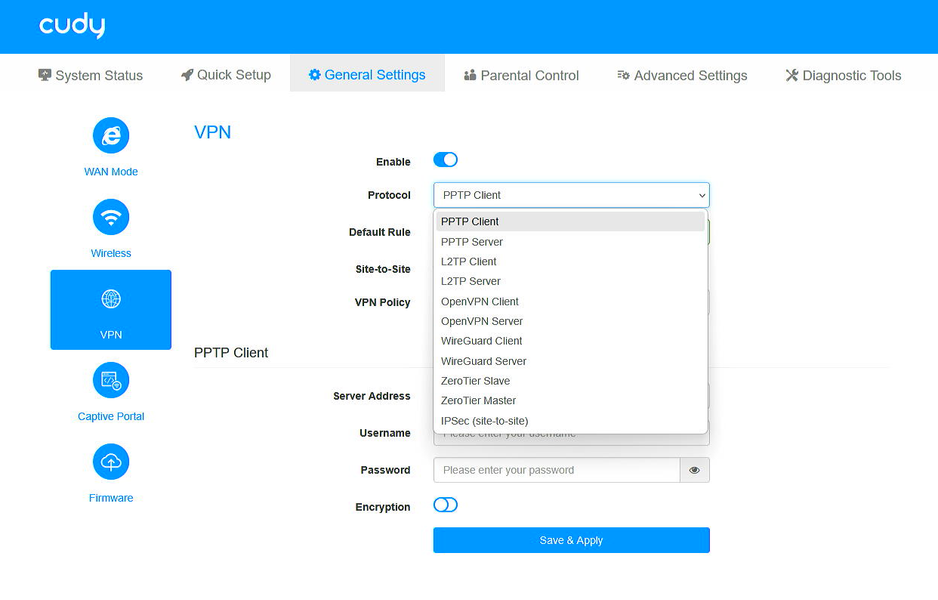 Протоколов несколько: PPTP, L2TP, OpenVPN, WireGuard, ZeroTier и IPSec (туннелирование канала между двумя сайтами). OpenWrt не реализован — это обусловлено ограничениями чипа Broadcom. Некоторое недоумение вызывает то обстоятельство, что одновременно можно использовать лишь один протокол.