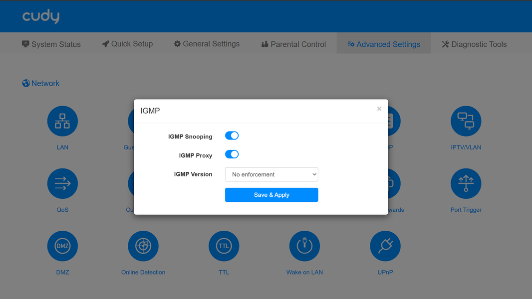 В управлении группами (Internet Group Management Protocol, IGMP) предусмотрено отслеживание активности (Snooping) и активация прокси.