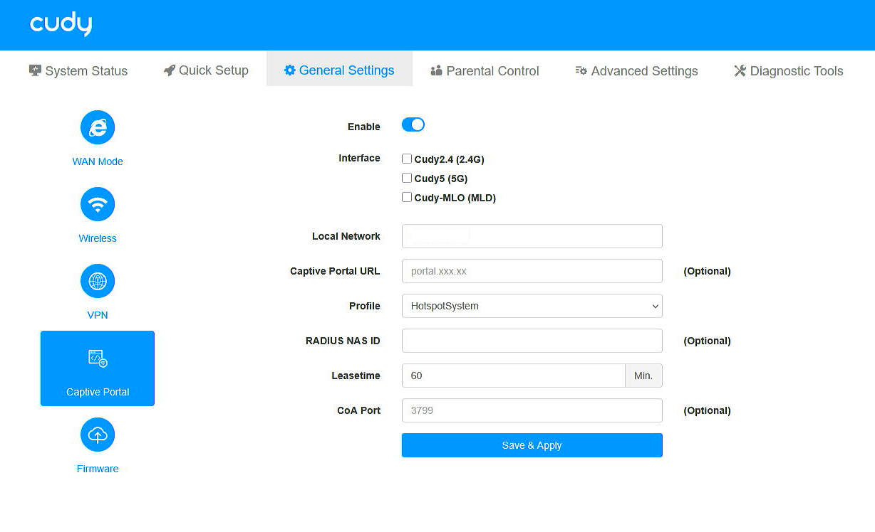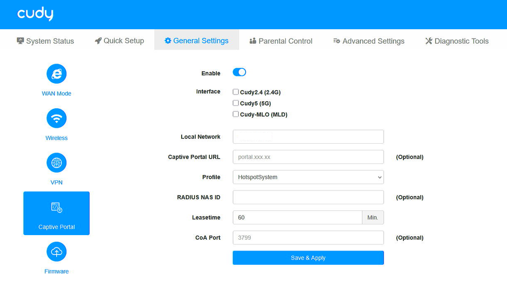 Четвертый подраздел — Captive Portal (назначенный портал) — то, чем роутер отзывается клиенту при соединении по радиоканалу. Доступны все три беспроводные опции: 2,4 ГГц, 5 ГГц и MLO.