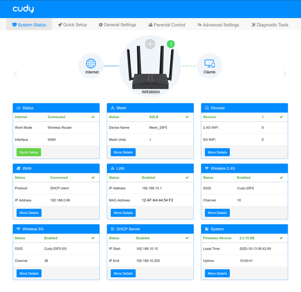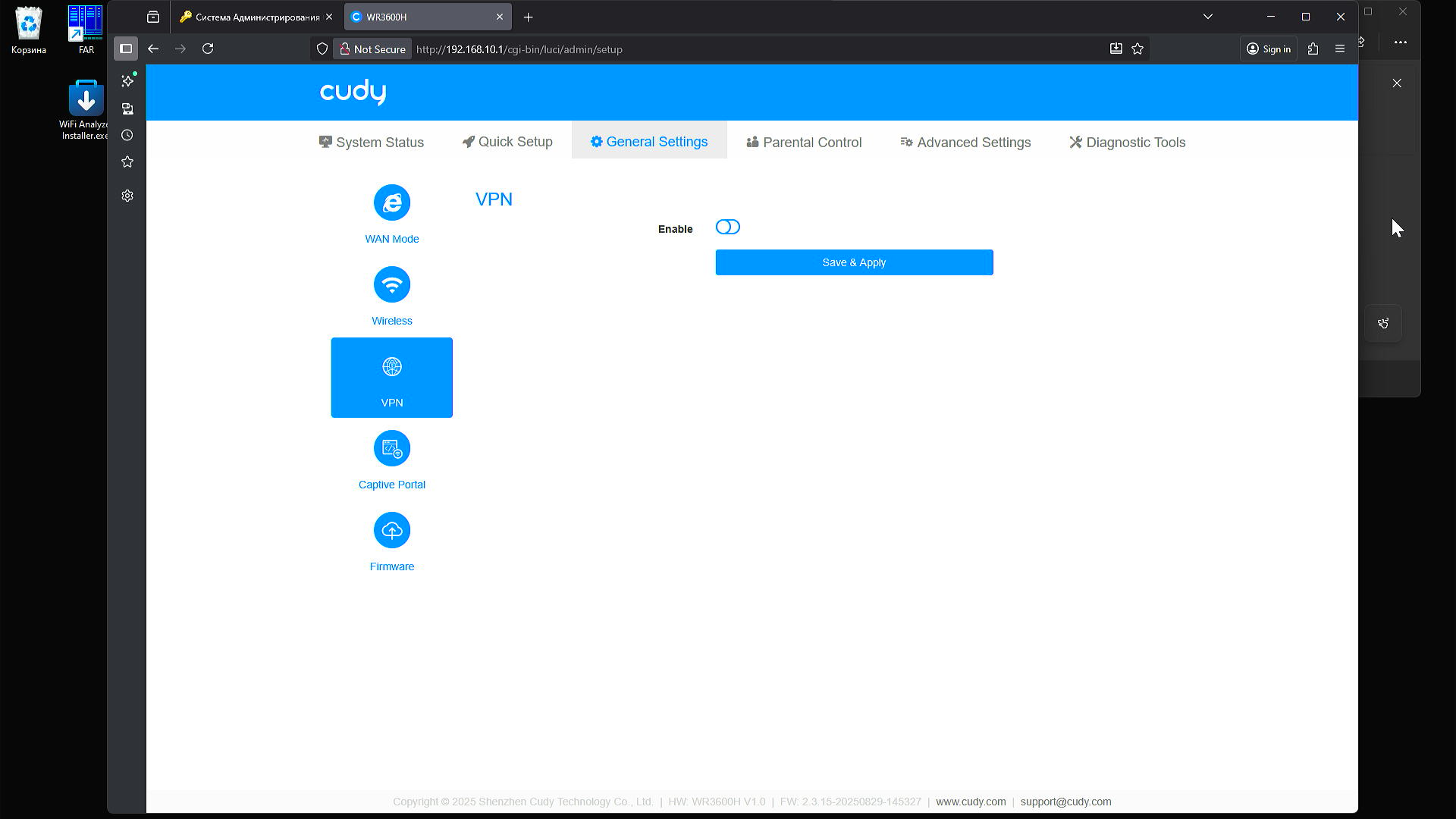 Подключим устройство к сети провайдера (WAN 2500 Мбит/с), к нему — ПК или ноутбук (LAN 1000 Мбит/с) и адаптер питания (механического выключателя у роутера нет). С подключенного компьютера обратимся к Cudy WR3600H по адресу 192.168.10.1.