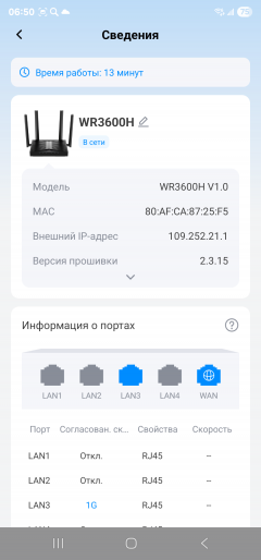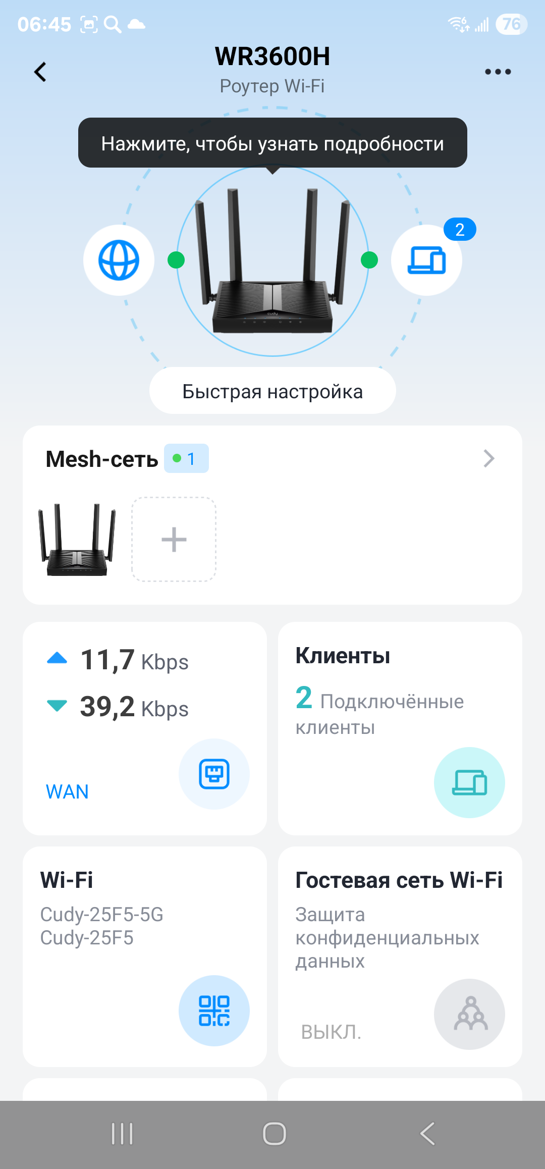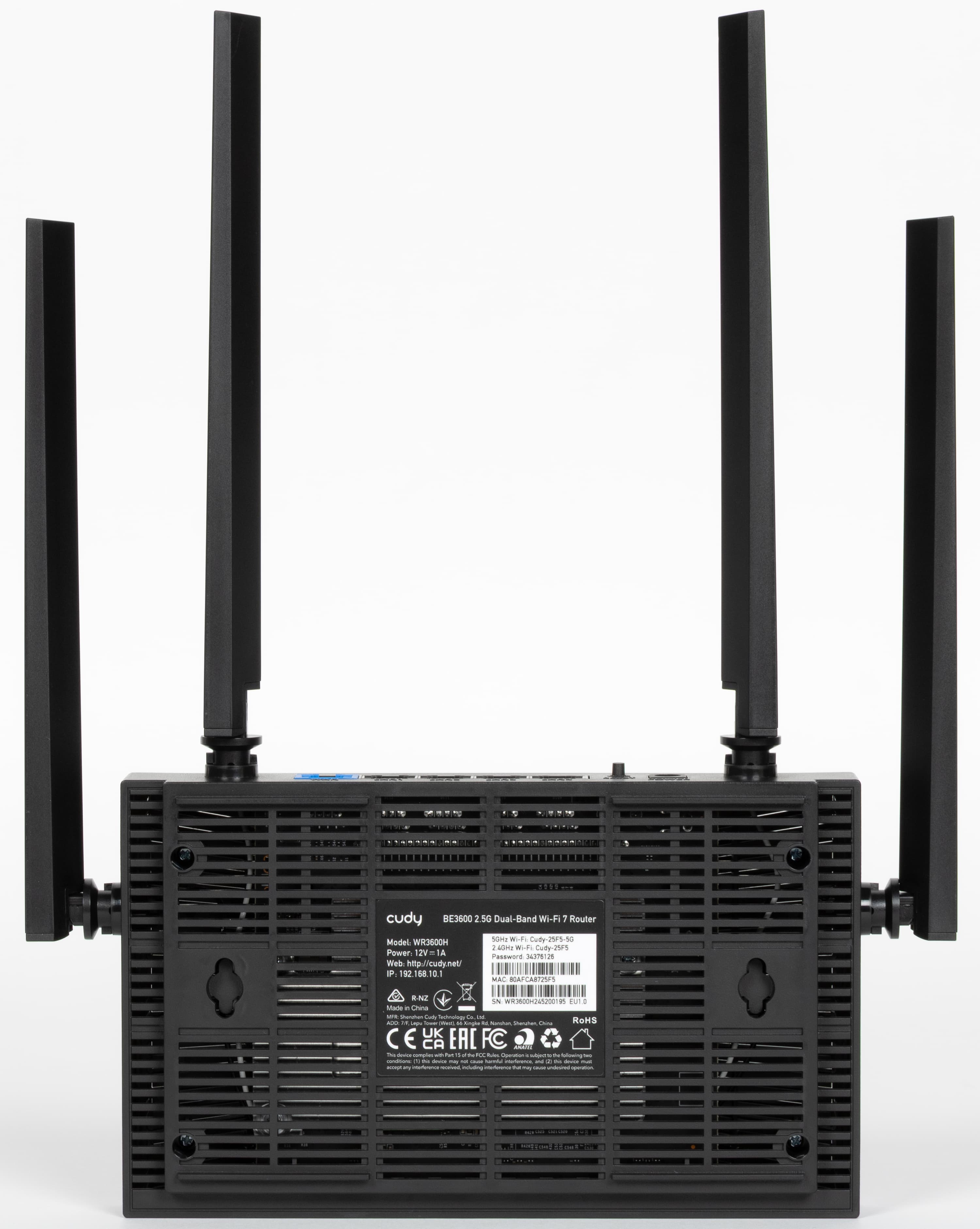 Аппаратная платформа роутера представлена однокристальной системой Broadcom с 64-битным четырехъядерным ARM8 Cortex-A7, 512 МБ памяти и радиомодемами, обещающими максимальную скорость 3600 Мбит/с, что в полтора раза превышает возможности распространенных клиентов с «потолком» 2402 Мбит/с. К Cudy WR3600H нет претензий ни по части маршрутизации в проводных сетях, ни по части покрытия и скоростей соединения по Wi-Fi. Multi-Link Operation (Wi-Fi 7) работает, причем дает возможность получить выигрыш в скоростях до 20%. Привлекательность устройства для непритязательных пользователей несомненна, а для «продвинутых» — несколько ограничена. Например, с его помощью нельзя «собрать» OpenWrt, не реализована работа в диапазоне 6 ГГц, ширина полосы ограничена 160 МГц (320 МГц отсечены). Два последних обстоятельства имеют объективные основания в виде отсутствия окончательного разрешения Госкомитета по радиочастотам, а первое остается на совести Broadcom. Неудачными решениями следует признать организацию портов Ethernet: четыре LAN по 1 Гбит/с плюс один WAN 2,5 Гбит/с, причем LAN и WAN нельзя переназначить, хотя для локальной сети порт 2,5 Гбит/с важнее, чем для провайдерского транка, который в подавляющем большинстве случаев едва обеспечивает 1 Гбит/с. Отсутствие порта USB не позволяет подключить «к коробке» внешние устройства. Но в работе роутер надежен («не отваливается»), греется едва-едва, да и ценовая доступность пока привлекательна: около 5 тысяч рублей на момент публикации обзора.