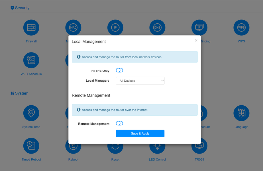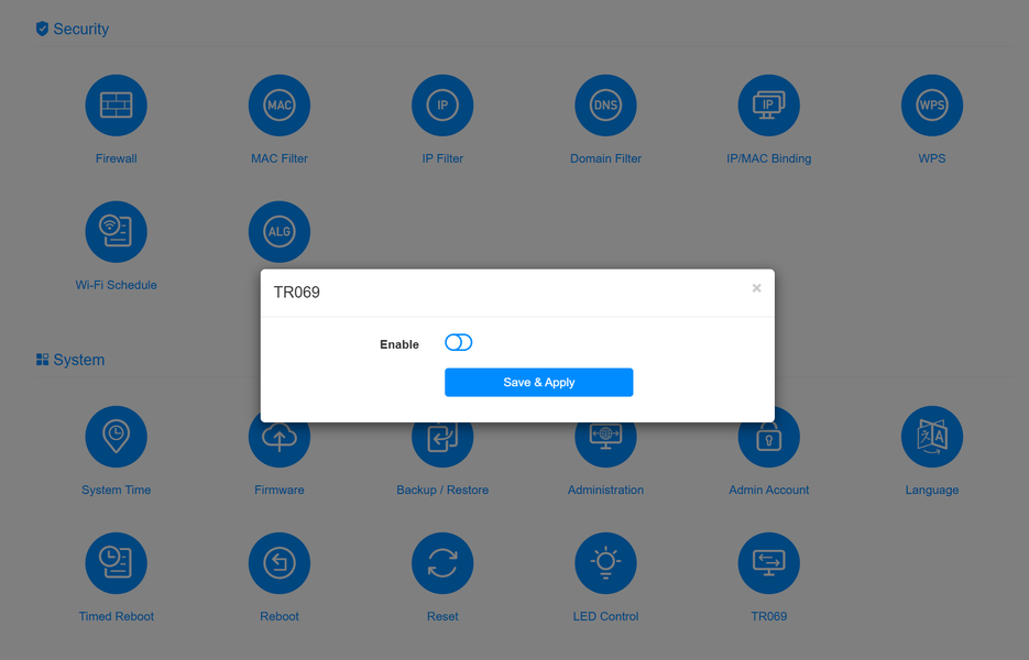 Активация TR069 — стандарта удаленного управления оборудованием через интернет по протоколу CWMP (Customer Premises Equipment WAN Management Protocol), в том числе с автоматической конфигурацией при помощи удаленных серверов.