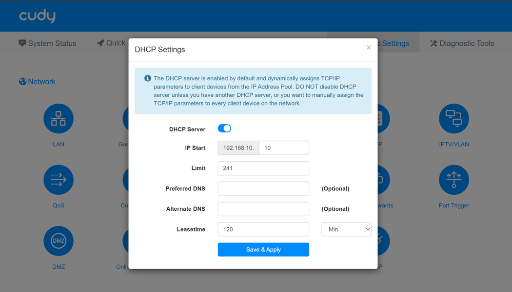 Конфигурация встроенного сервера DHCP (Dynamic Host Configuration Protocol) с указанием начального (IP Start) и конечного (Limit) IP-адресов, а также опционально — предпочитаемого (Preferred) и вторичного (Alternate) DNS (Domain Name Server, сервера доменных имен) и длительности их «аренды» (Lease Time).