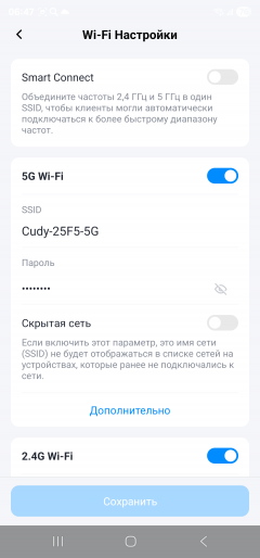 Настройка беспроводного соединения с установкой вида шифрования сигнала. Как всегда, они указываются раздельно для диапазонов 2,4 ГГц и 5 ГГц.