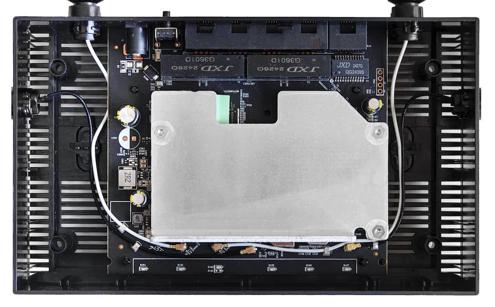 После снятия днища ничего особенно интересного взору не открывается: вычислитель и прочие компоненты SoC (однокристальной системы) закрыты теплосъемной пластиной. Хорошо видна разводка антенн. Пайка и монтаж выполнены безукоризненно.