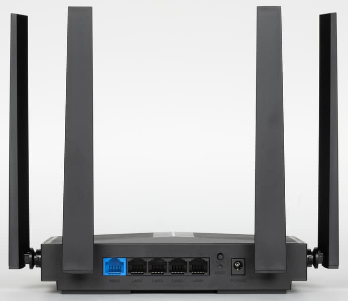 На задней панели имеется порт WAN (синяя розетка RJ-45) и четыре порта LAN (черные), кнопка Wi-Fi, скрытая кнопка сброса и коаксиальный разъем адаптера питания. Аппаратного выключателя нет.