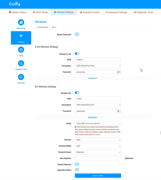 Вторая позиция — Wireless (беспроводное соединения) — выглядит богаче того набора опций, который мы видели в быстрых настройках. Здесь можно выбрать канал, его ширину, энергию передатчика и предусмотреть сокрытие имени сети и разделение клиентских подключений.