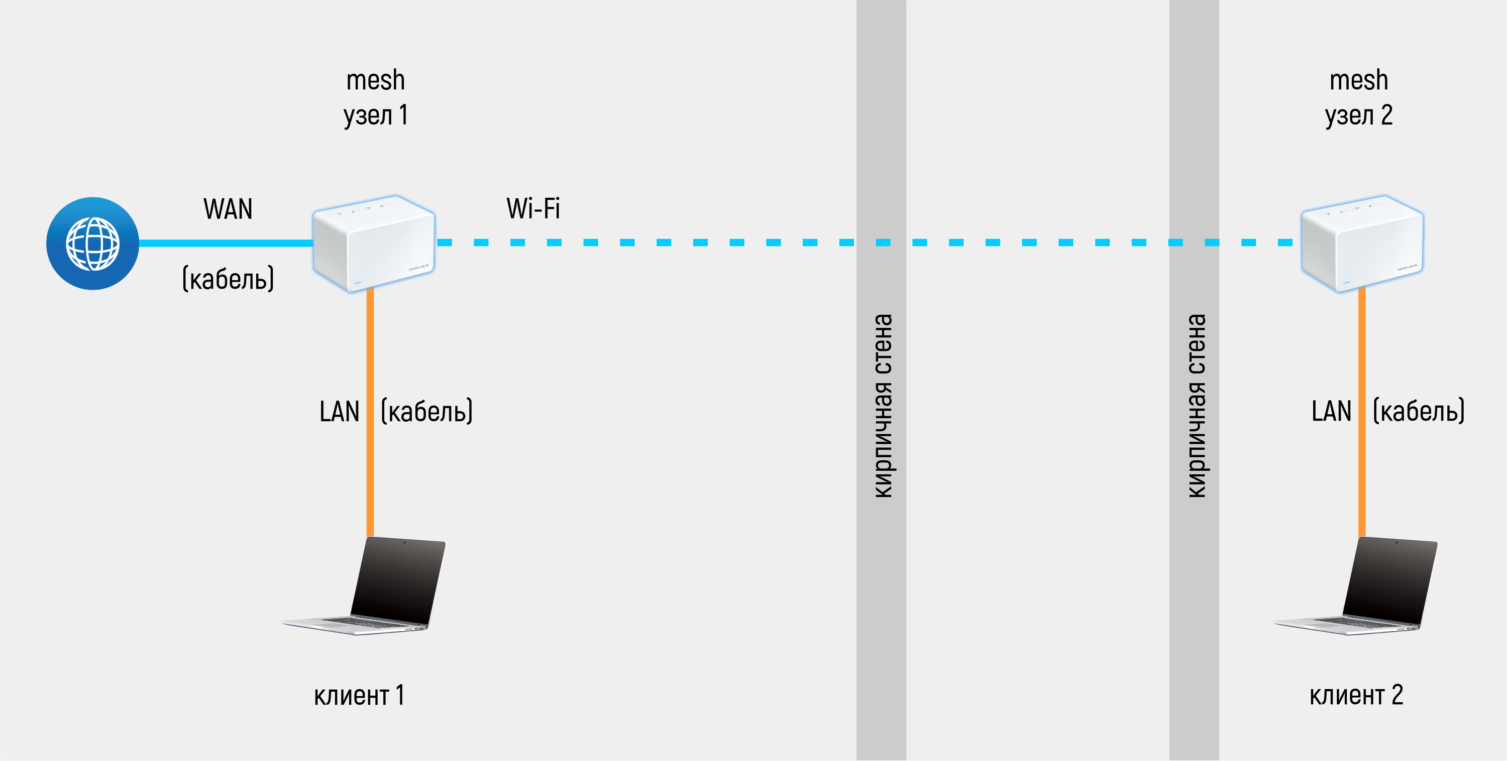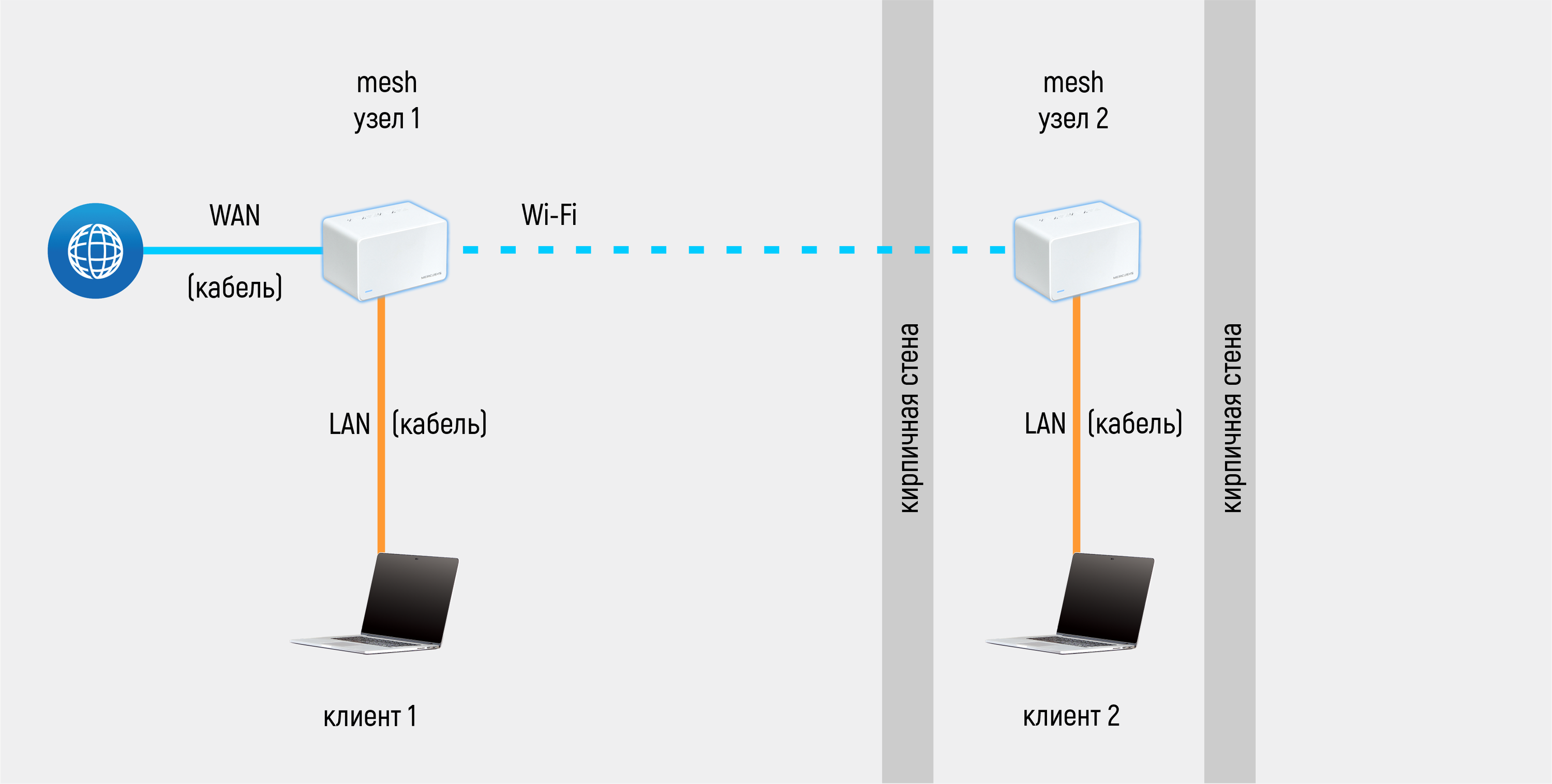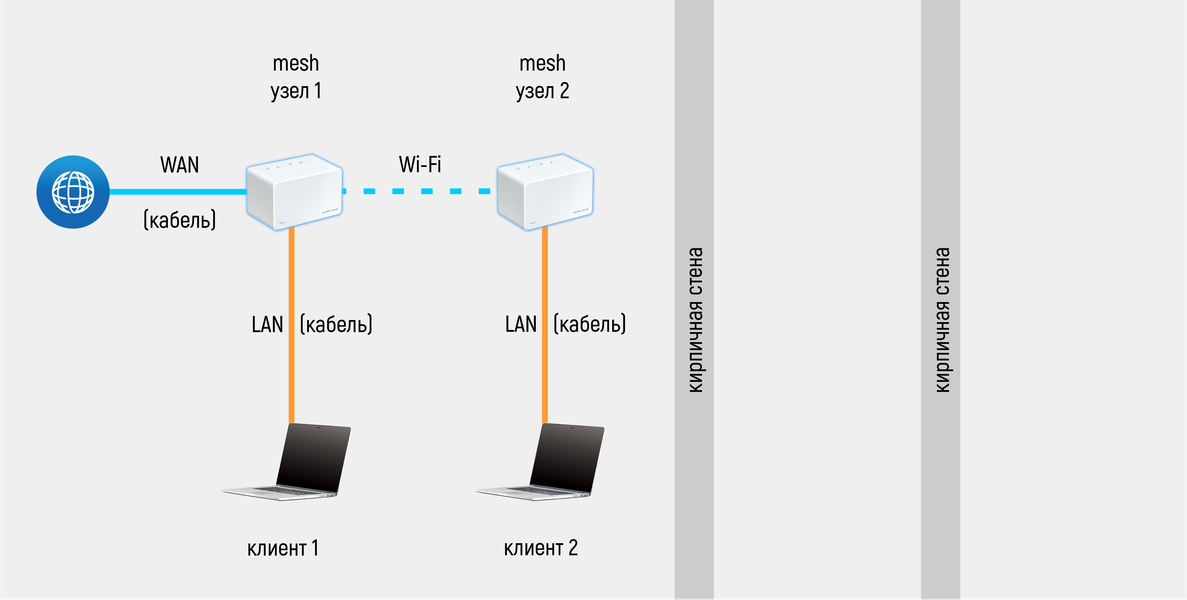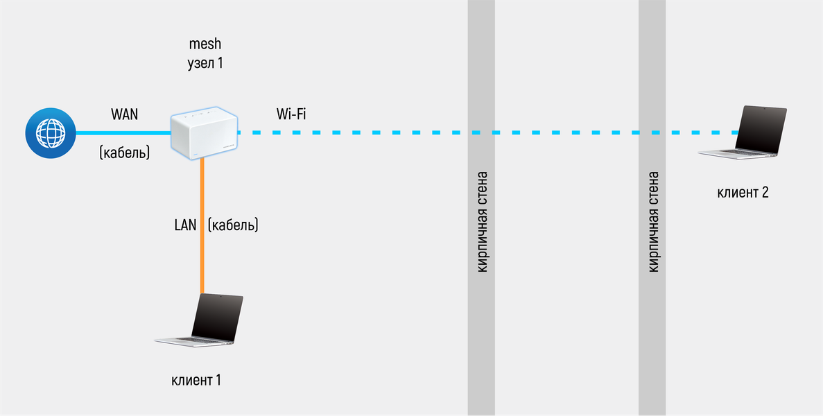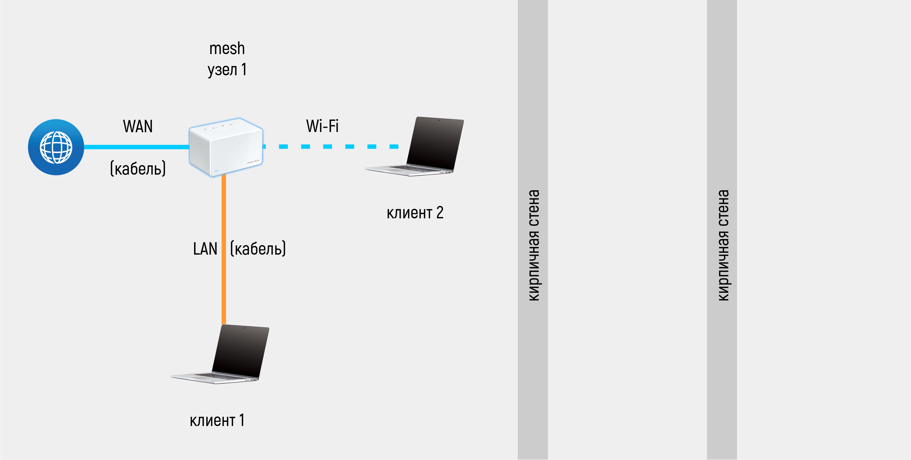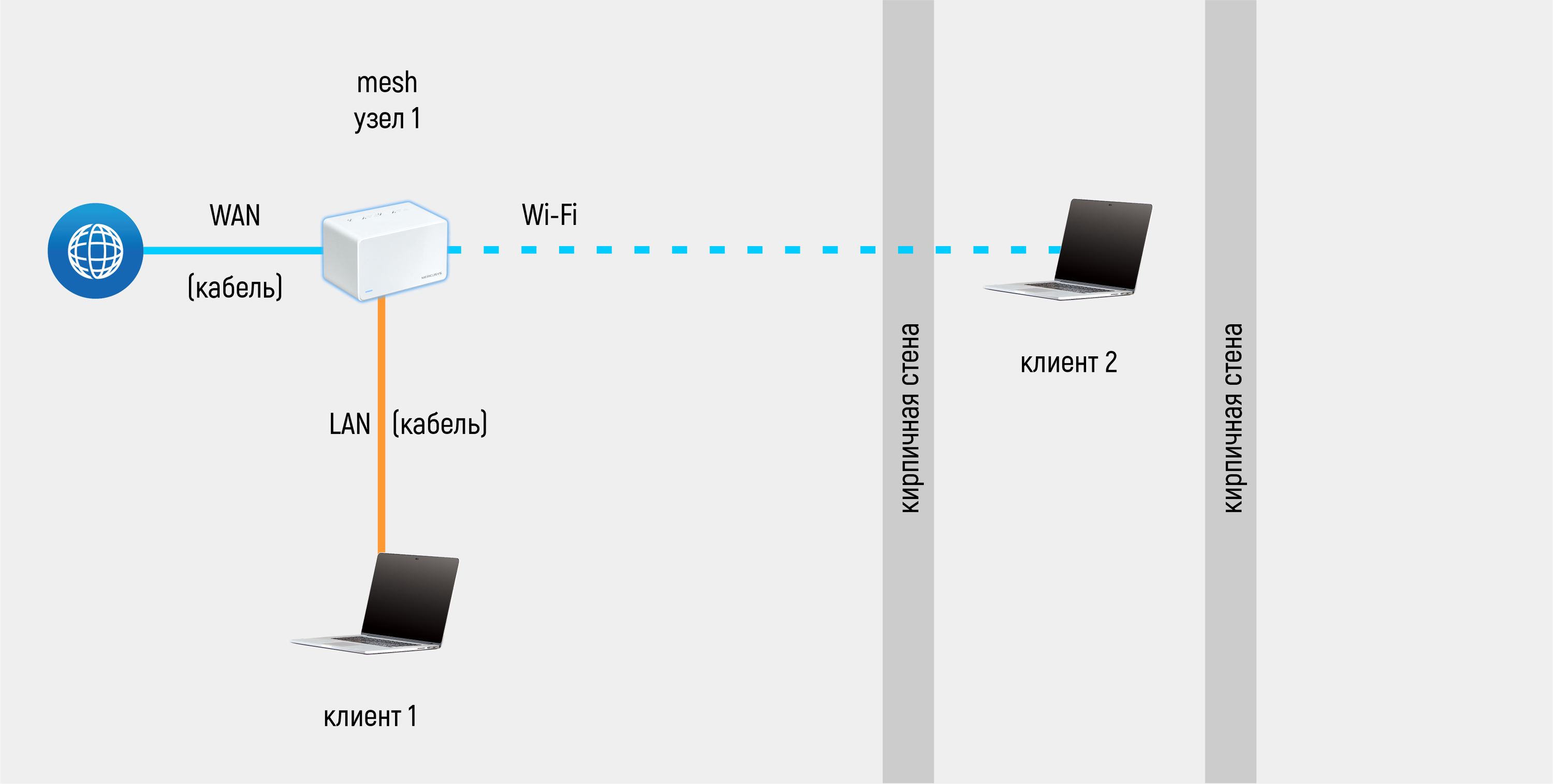 Переместим клиентов в соседнее помещение за кирпичной стеной, разместим их на расстоянии 6 м от роутера и подключим ко второму узлу mesh-сети Halo.