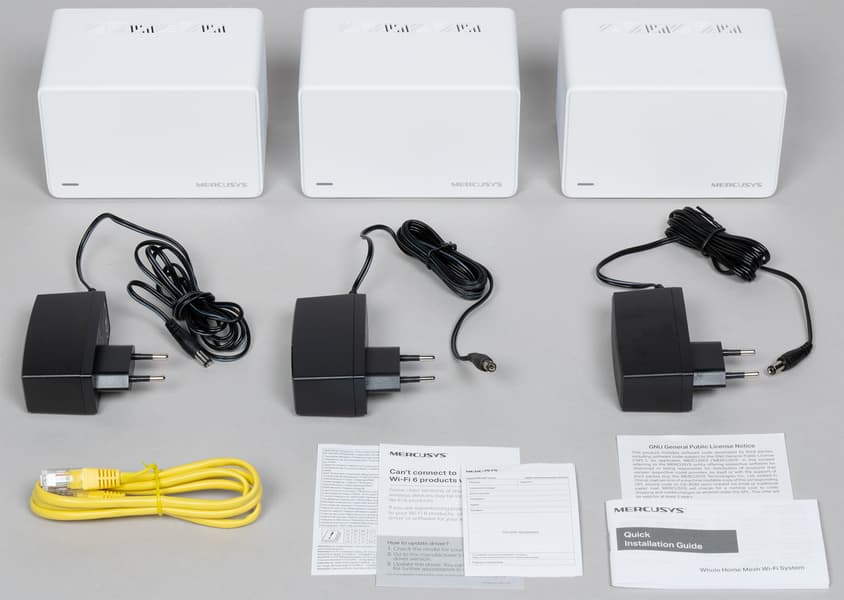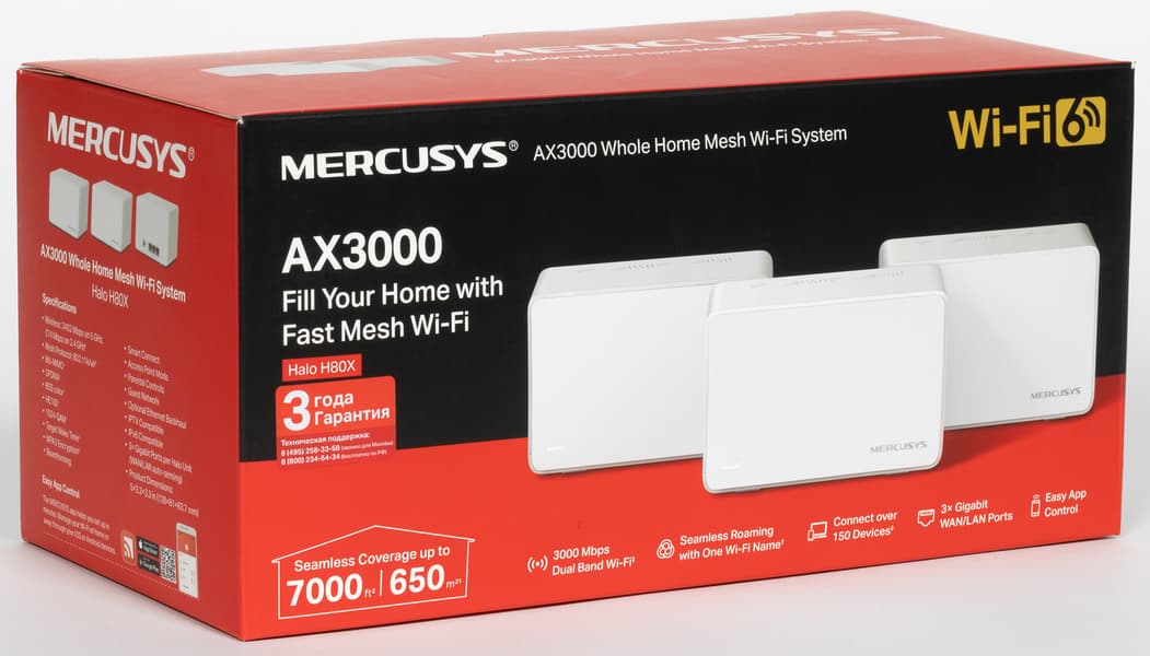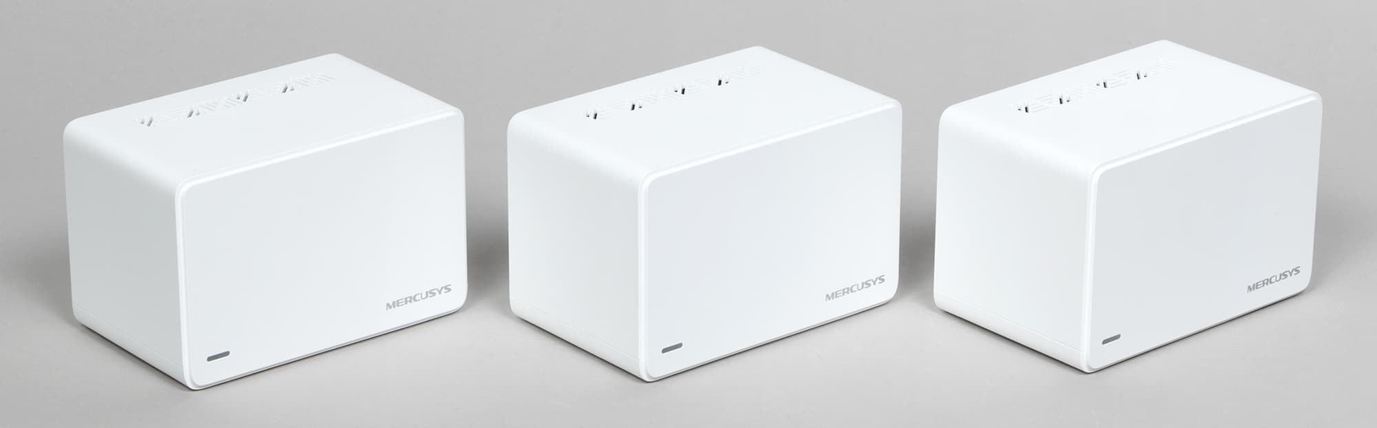 В интернет-каталоге компании Mercusys представлено 6 разных видов mesh-систем, и все они доступны в виде трех- и двухблочных наборов. Наш отчет посвящен наиболее совершенному из доступных на сегодняшний день трехблочному комплекту Mercusys Halo H80X.