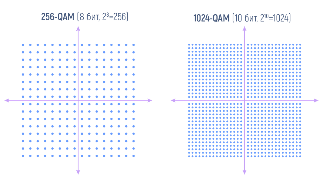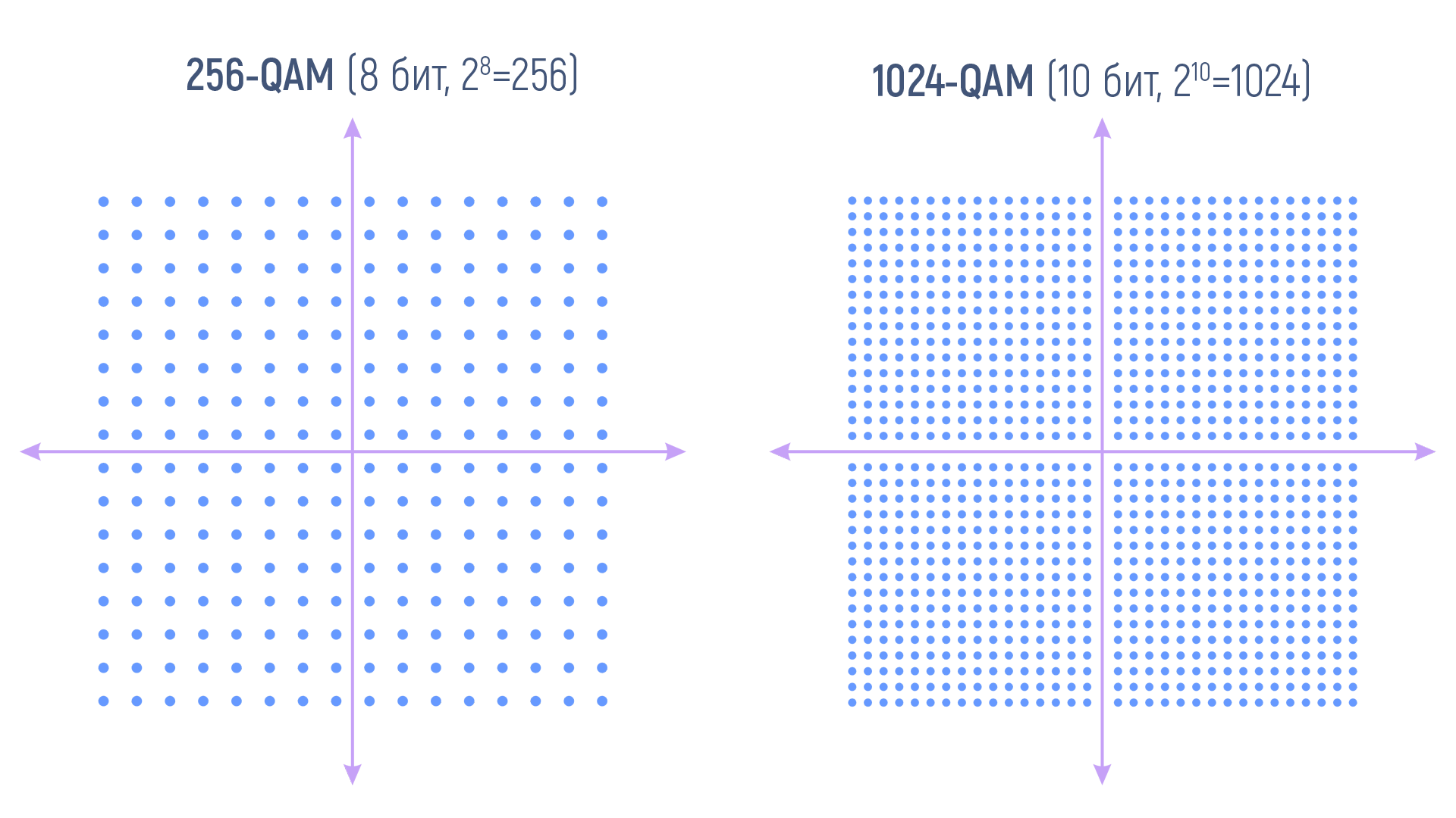 - Использование расширенной до 10 бит/символ квадратурной амплитудной модуляции 1024-QAM (210=1024) с возможностью плотнее упаковать данные кодировании и повысить скорость обмена ими по сравнению с 8 бит/символ (28=256-QAM)